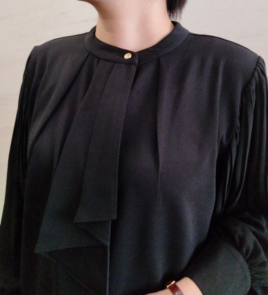 首元の金釦とリボンを結ぶ必要のない、流れるようなドレープのボウタイの華やかなデザインがアクセントに✨
