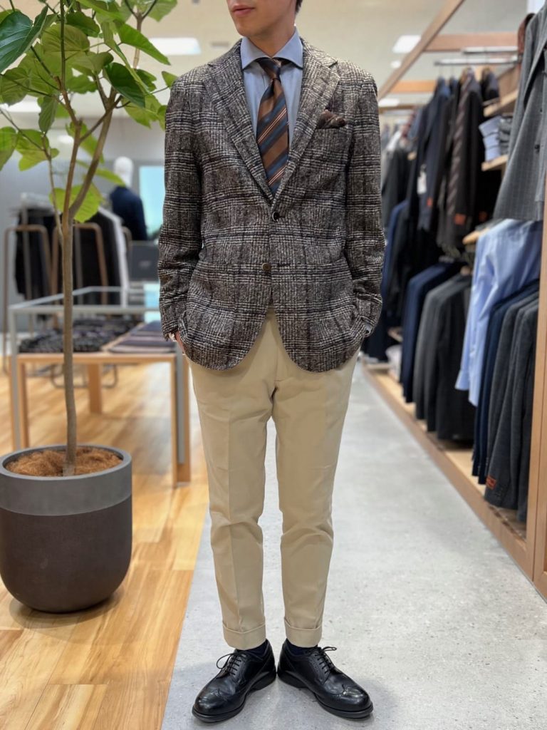 ツイードライクな表情のブラウンチェック柄のジャケットとベージュのパンツを合わせてみました!