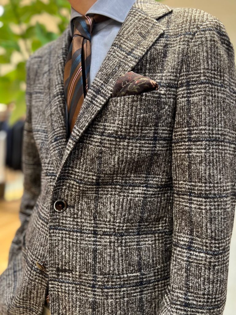 また、こちらのジャケットも前回のブログでご紹介させていただいた「パラシュートウール」のジャケットと同じ「サンタルチアゼロ」モデルで仕立てており、肩パット不使用で毛芯を無くしたオンリー史上最軽量のジャケットモデルなんです!