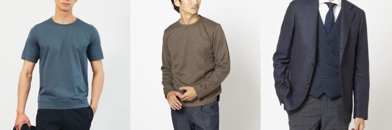 夏場はコットンの半袖Tシャツ、すこし肌寒い時期には同じくコットンの長袖Tシャツ、本格的に冷えてきた時期には裏起毛のニットや中綿ベストなどを展開し、スーツやセットアップとの合わせやすさから大変ご好評頂いてまいりました✨