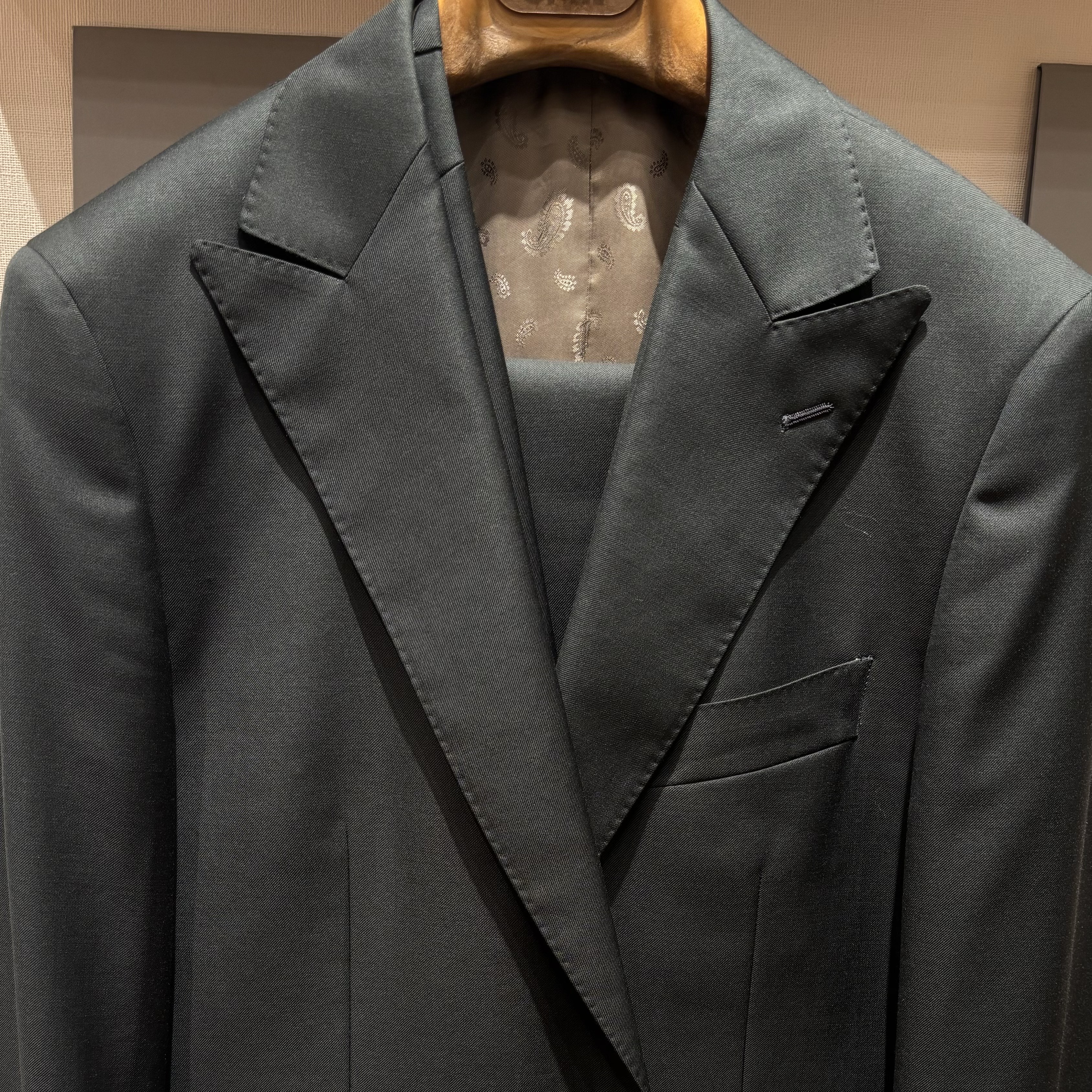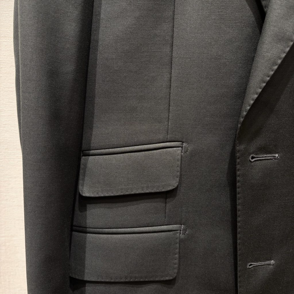 ラペル(スーツの下襟の部分)の形(写真はピークドラペル)が選べたり、ステッチの入れ方(このスーツはAMFステッチ:手縫い風)、ポケットの角度の変更やチェンジポケットを追加することができたりと、細部までこだわることができます✲