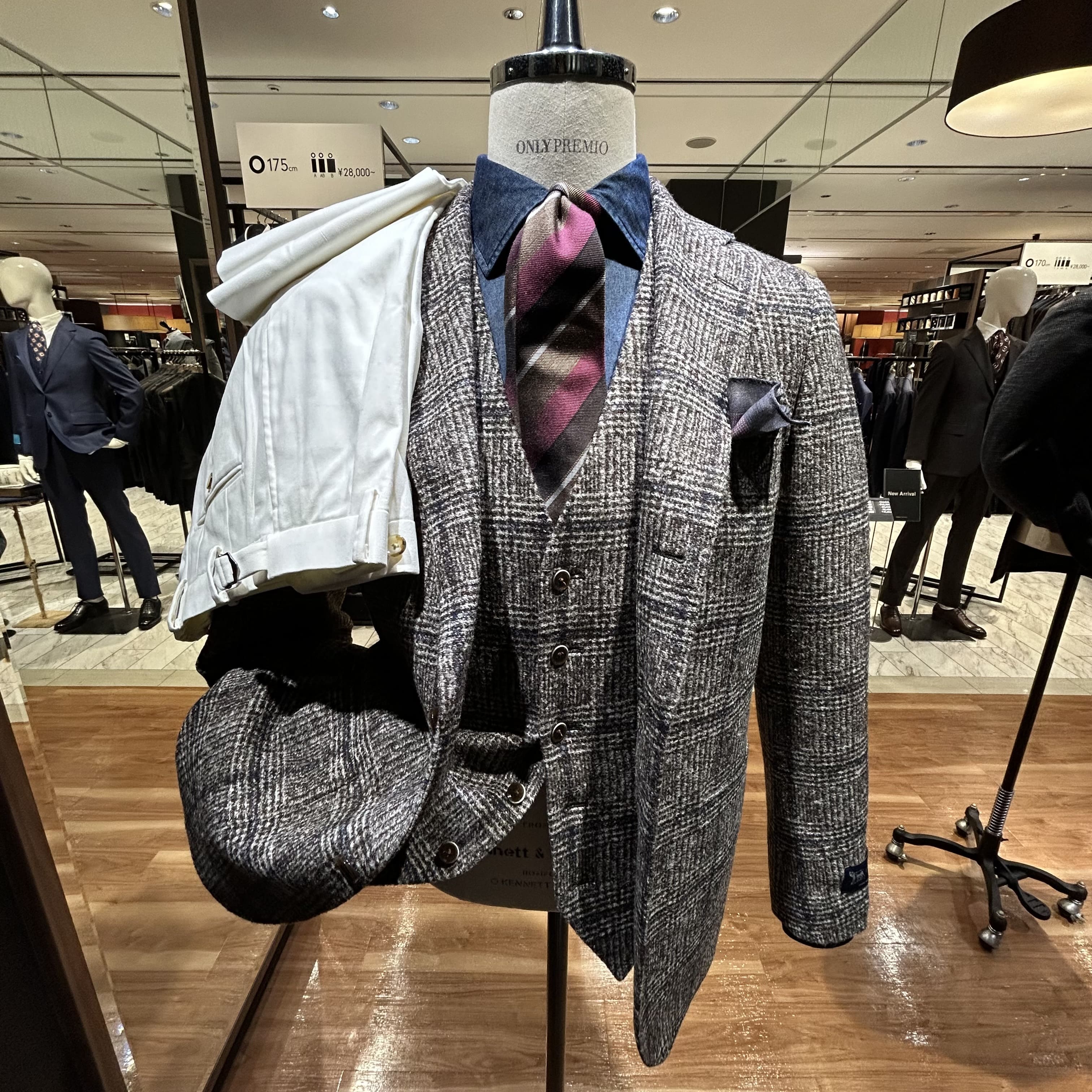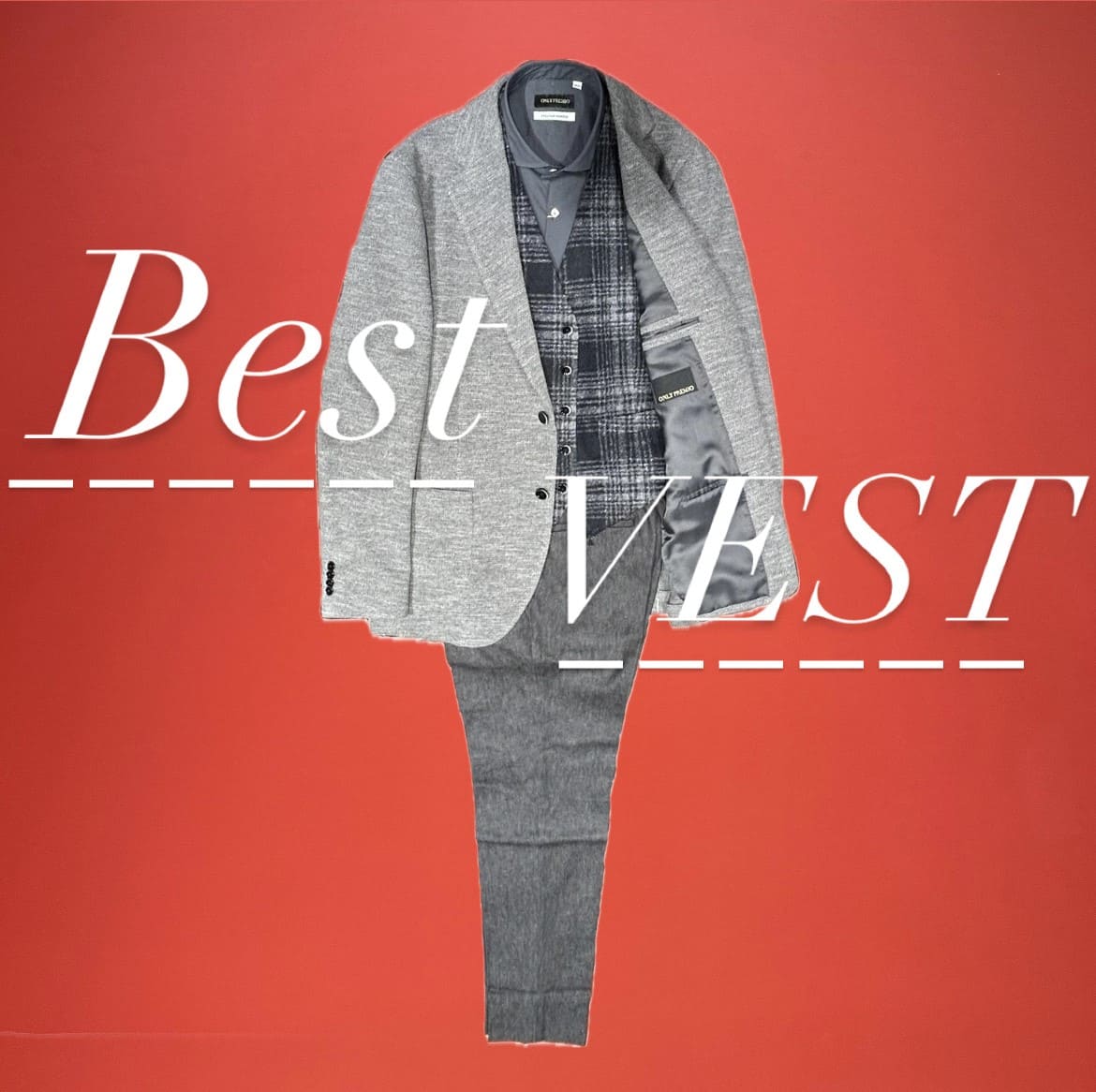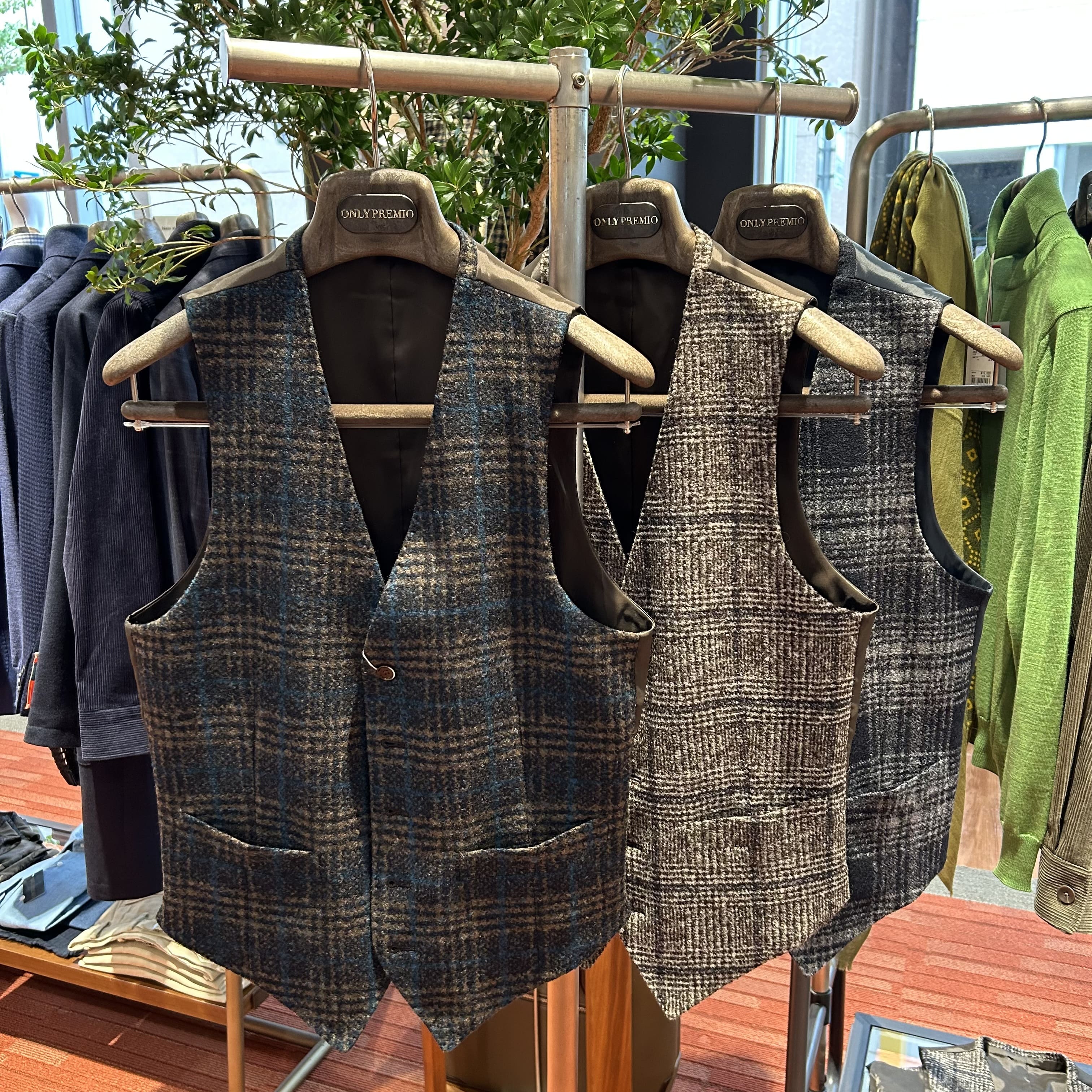 ジャケットと共生地のベストを展開。ジャケパンスタイルは程よく抜け感があり、大人な雰囲気が出て格好良いですよね。けれども、抜けすぎるとその品格は失われてしまいます。寒いからといって、迂闊にスポーティーなベストを合わせてしまったら上品な装いが「惜しい」ことに🙈