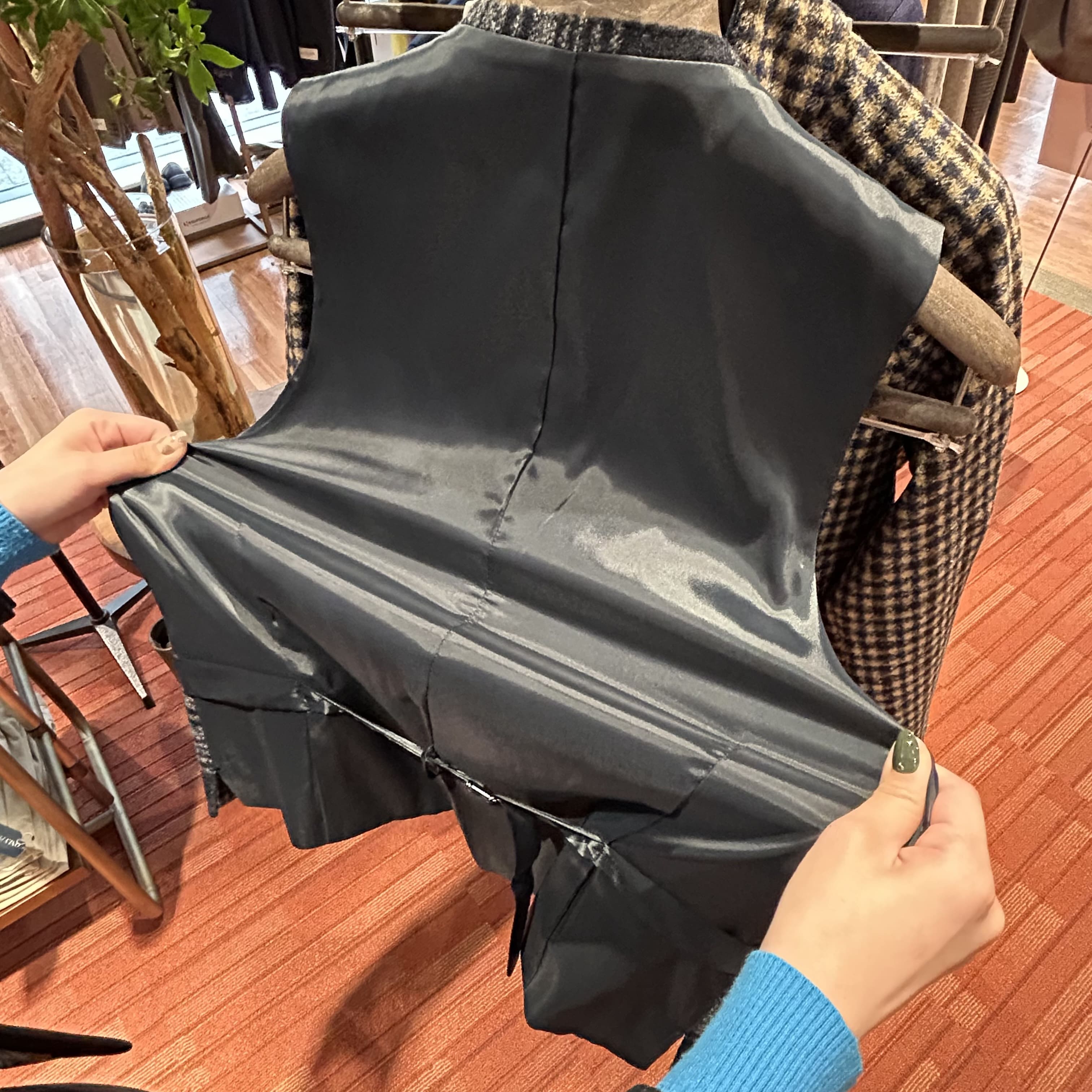 もちろん、他にもベストの展開はございます。昨年に引き続き大人気のTairo’s Vベスト、それに加えスーツで人気の極シリーズを表地にした中綿ベストも登場。どちらもジャケットの中に着るためにこだわり工夫されたベストなので、中綿の量はもちろん、フロントはドレスカット、背部にバックシンチを採用。スーツスタイルにも馴染んでくれるベストとなっております。