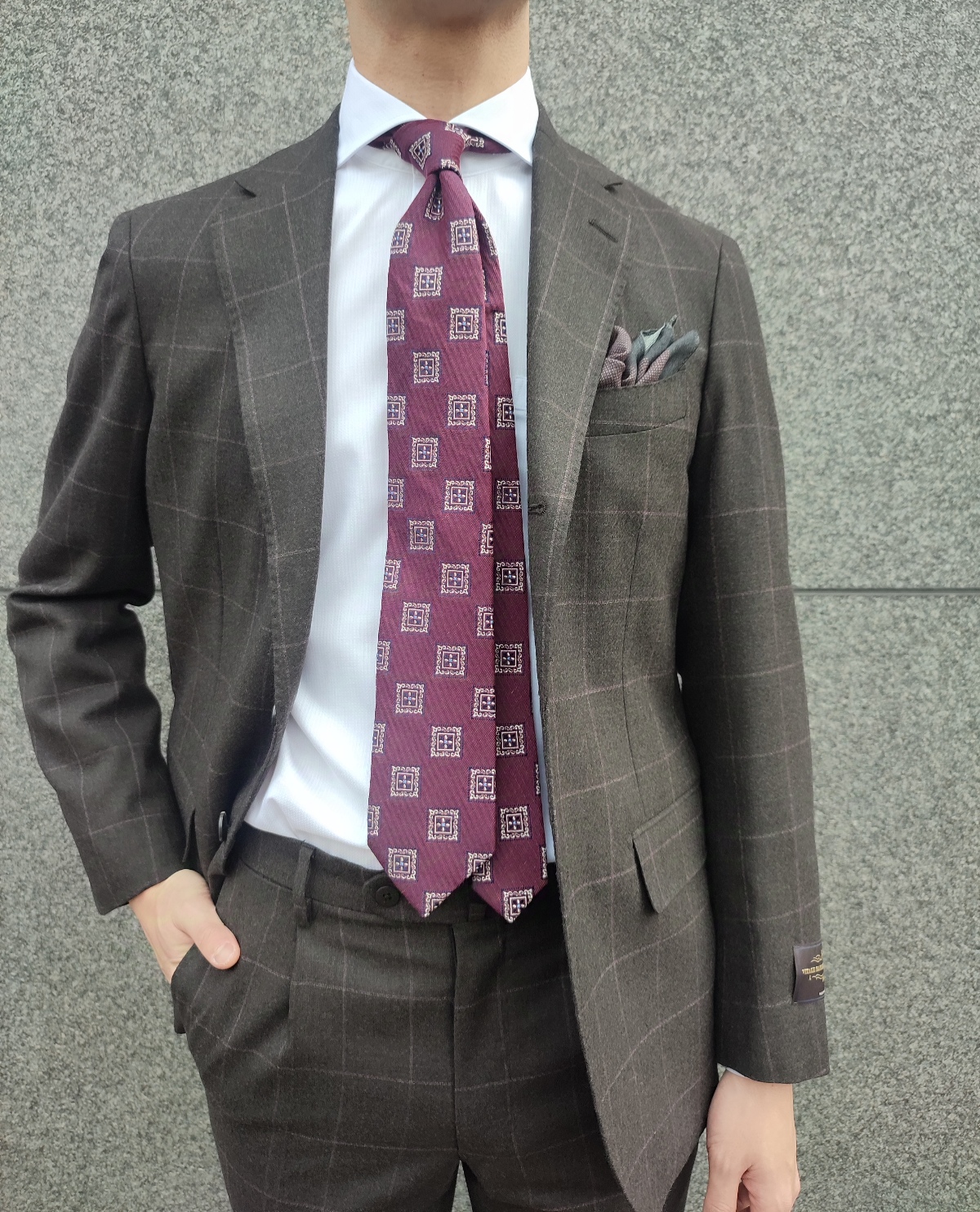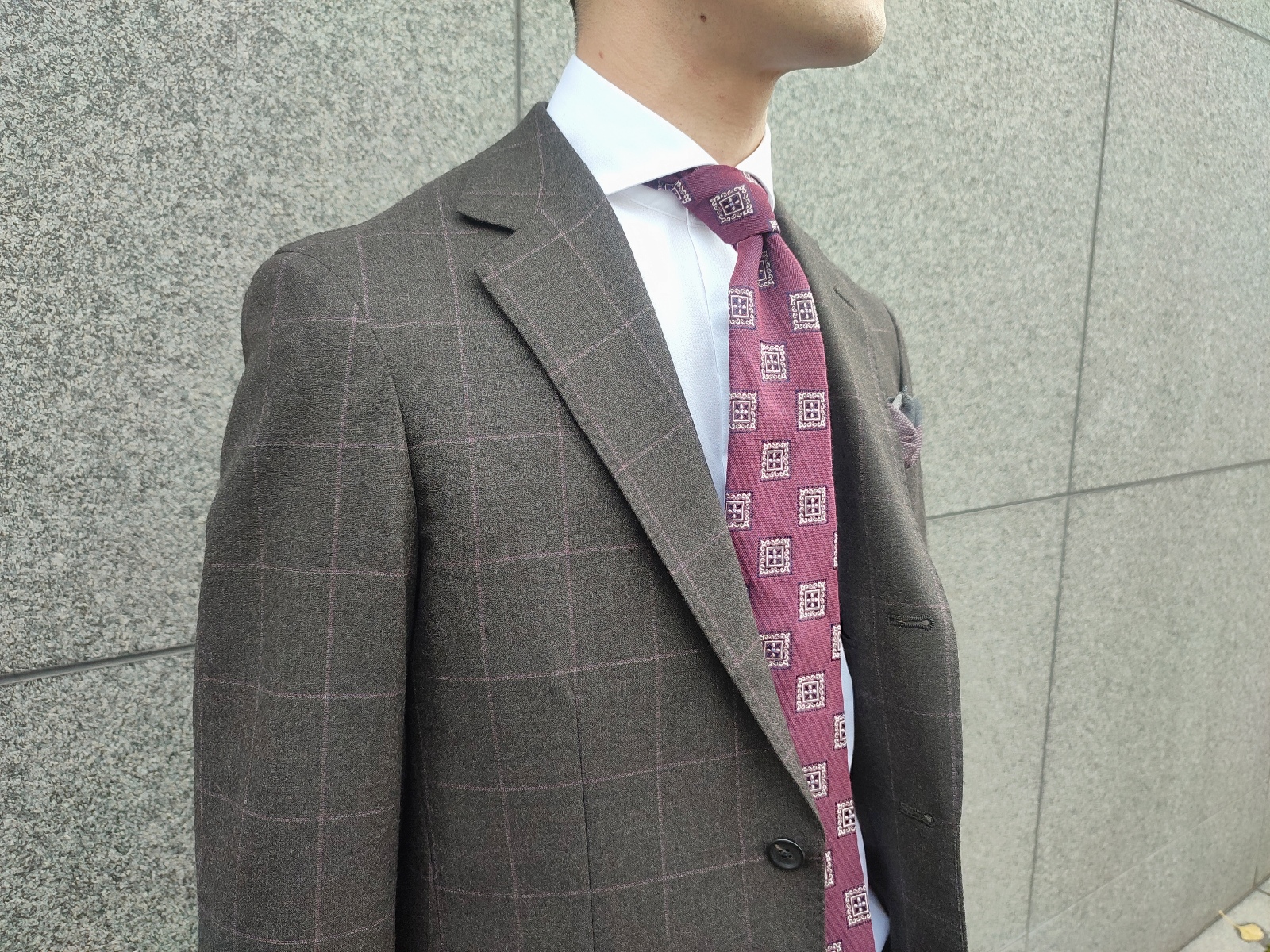 ブラウンのウィンドペーン柄のスーツは