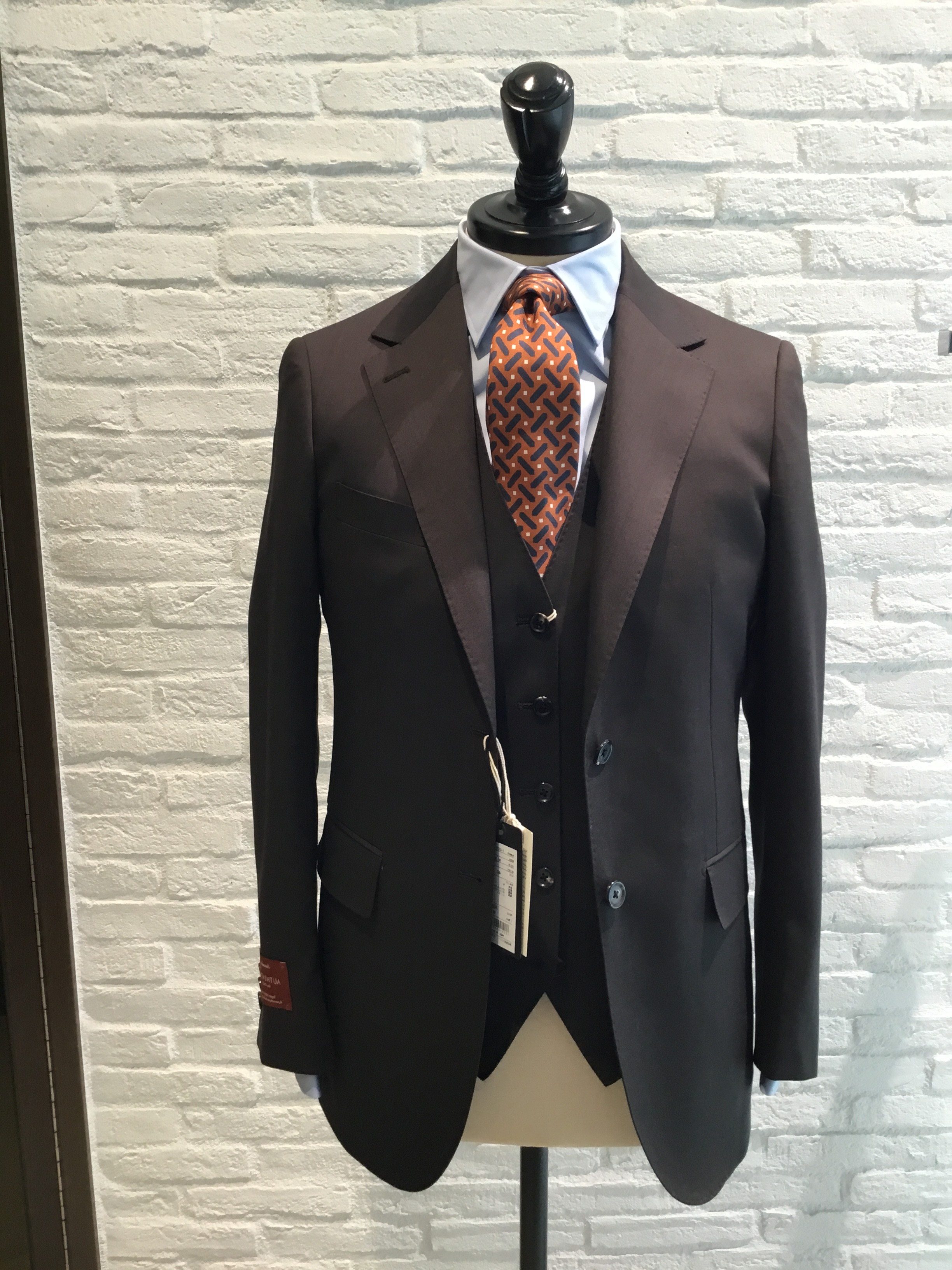 ブラウンの3ピーススーツです。程良い艶感があり大人っぽい雰囲気にしてくれます。
