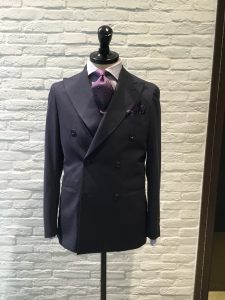 色は普遍的かつ王道のネイビーですが、ダブルブレストになっている為クラシックな雰囲気にしてくれます。またコットンスーツ特有の味の出方がするオススメスーツでございます。