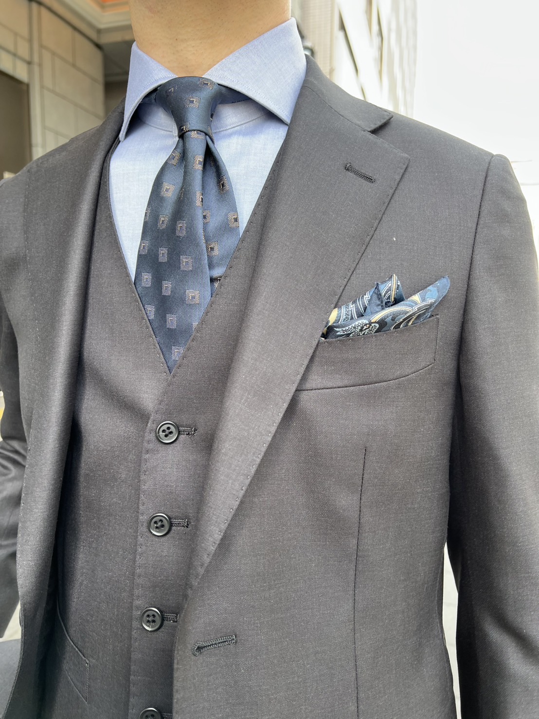 格式高いスーツの雰囲気を活かしつつ、普遍的なものになりすぎないようシャツはややグレートーンのブルーを合わせ、