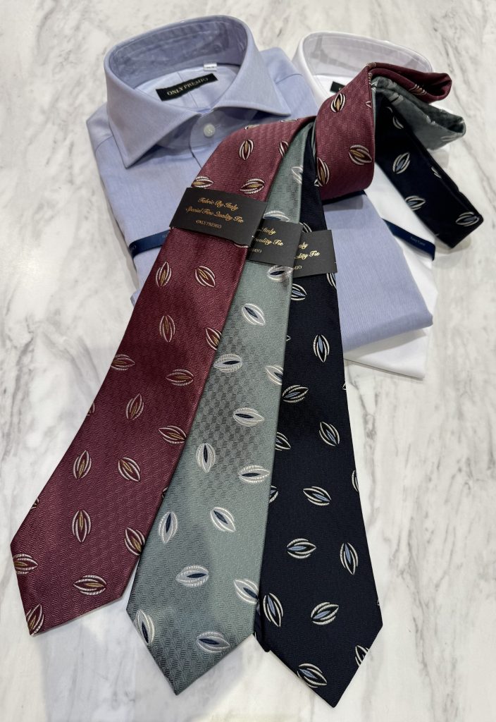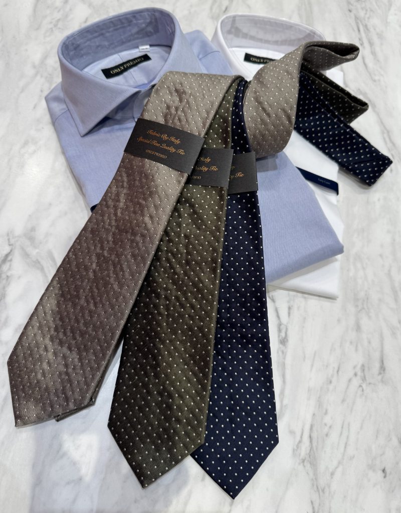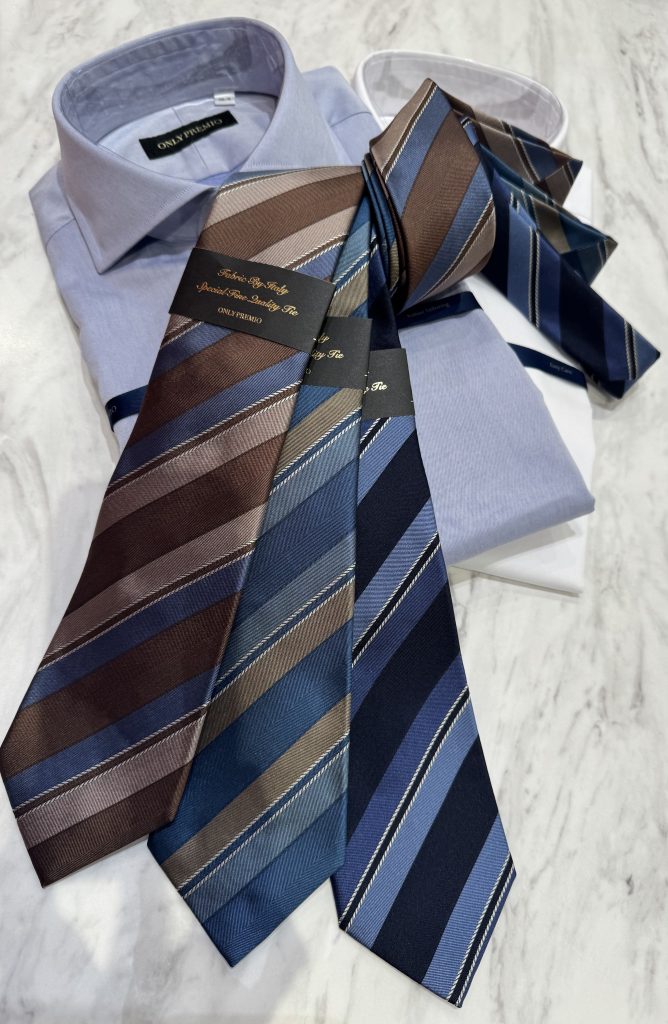 当店に入荷してきているONLY PREMIOのネクタイはイタリア生地を使用して日本で縫製している物になります。