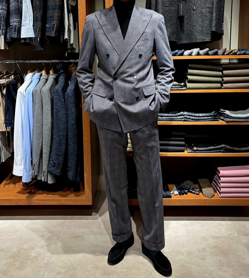 人気の『TRAVELER JERSEY』セットアップ(既製品)はシングルブレストのみの展開となっており、こういった形で仕立てられるのもオーダーならではです😊