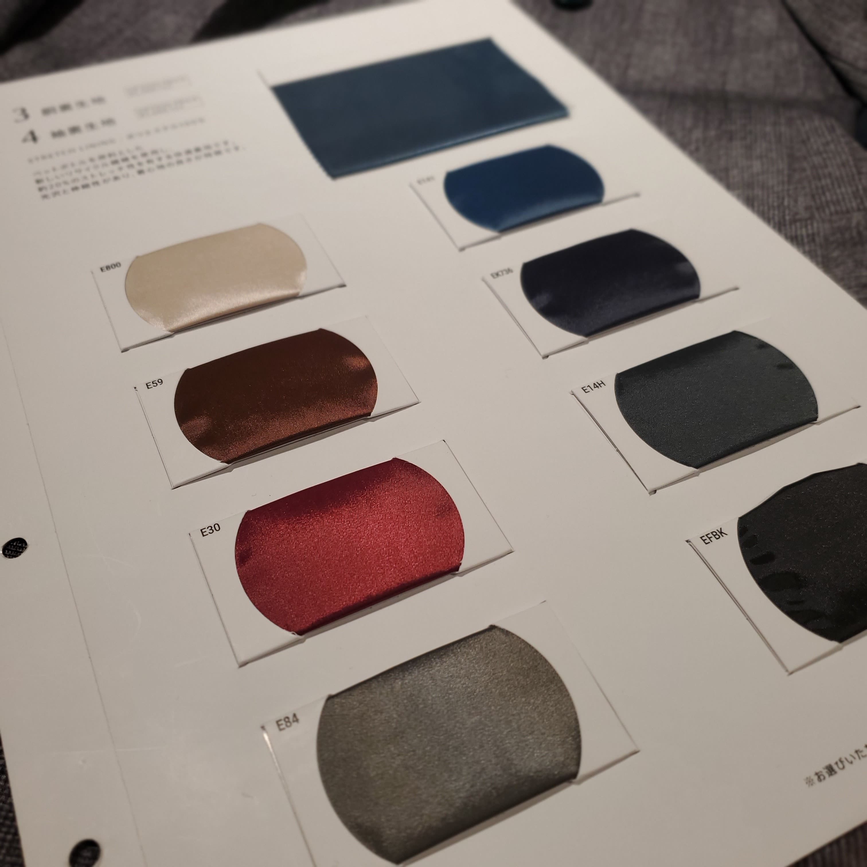 胴裏地はこちら含めキュプラの色柄に富んだものをお選びいただく方が多いですが、袖裏地は腕の運動性にも直結しますのでジャージー生地でなくともこういった伸縮性のある裏地がおススメです!