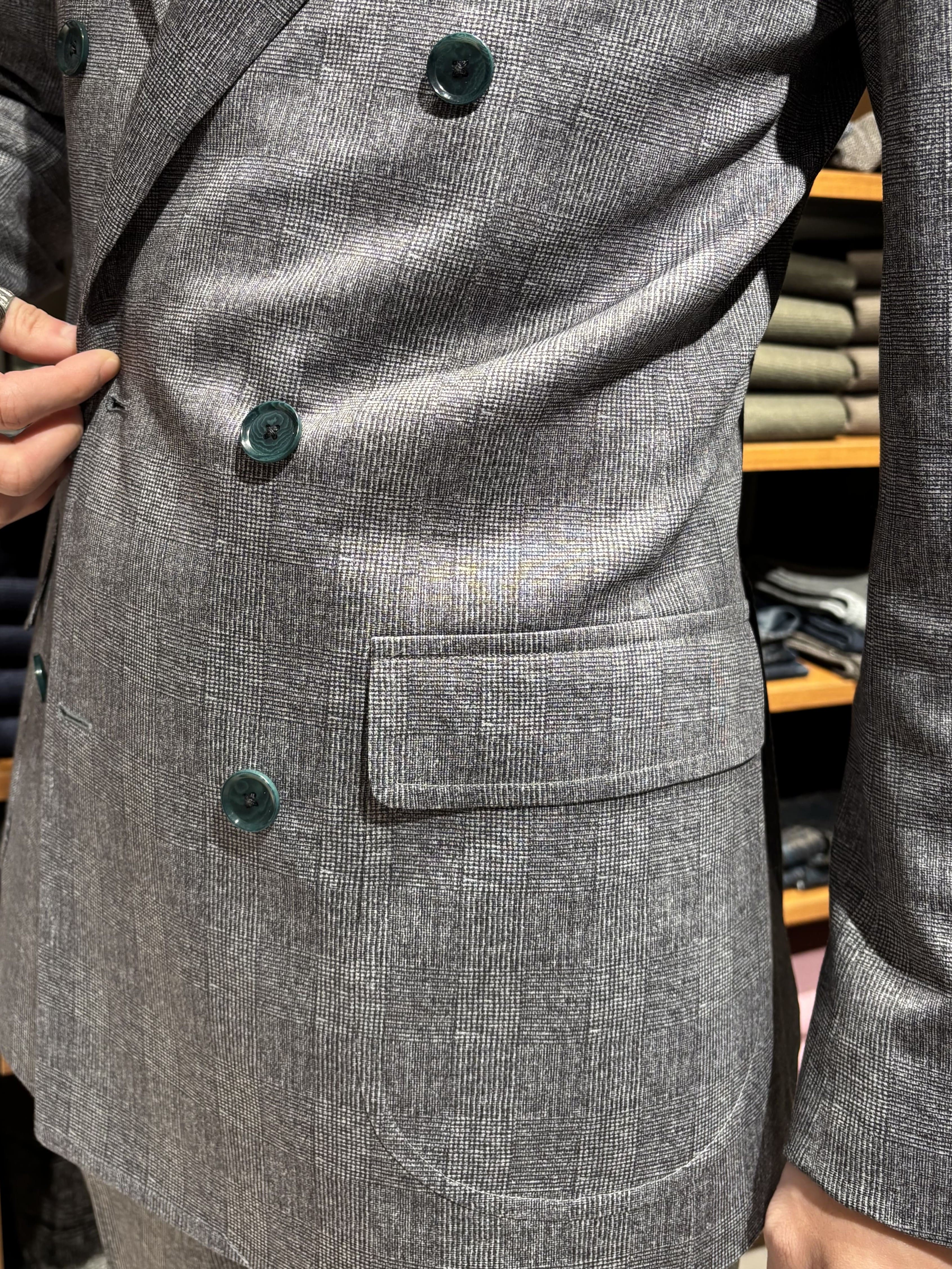 今回は大人っぽいグレンチェックのグレー生地でダブルブレスト仕立てに挑戦しました。