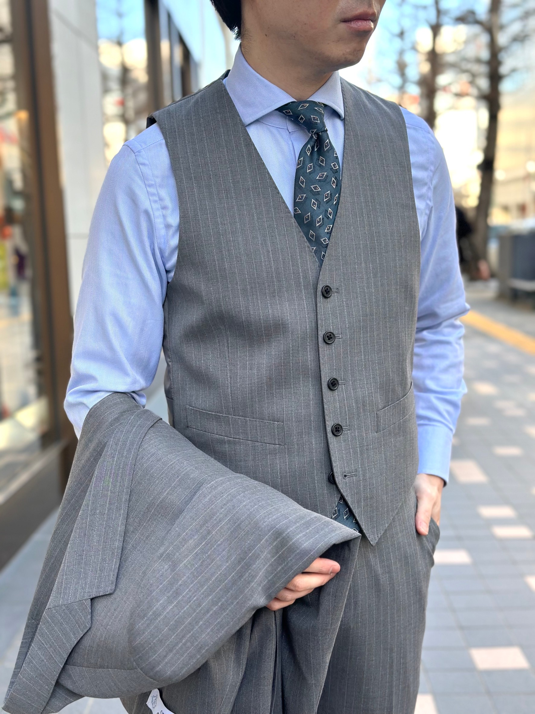 ライトグレーの3ピーススーツです✨