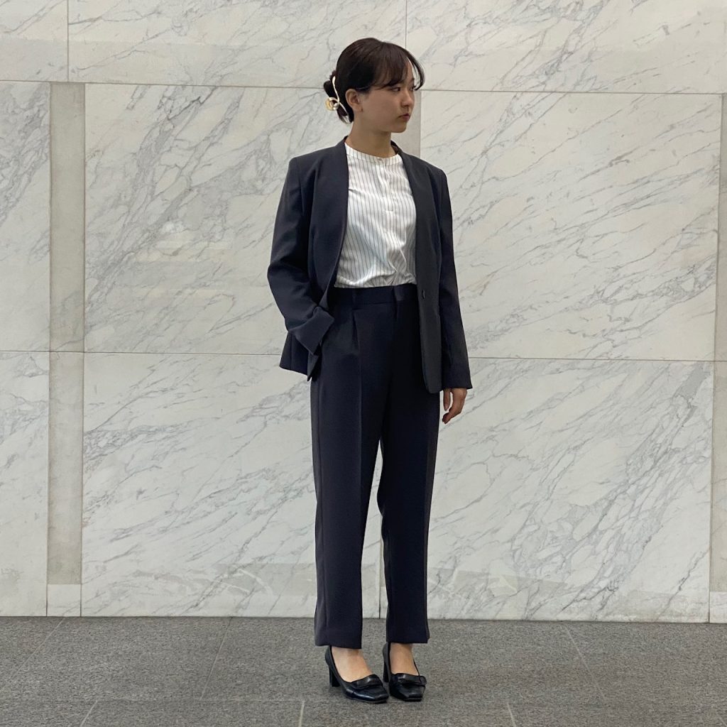 こちらはノーカラージャケットにややゆとりのあるパンツのセットアップです。