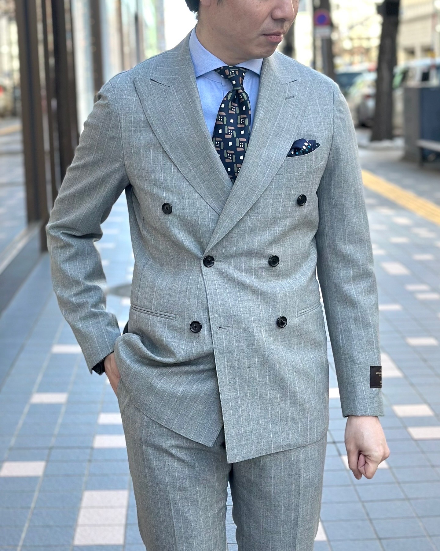見た目も爽やかなグレーストライプのダブルブレストスーツ🍃
