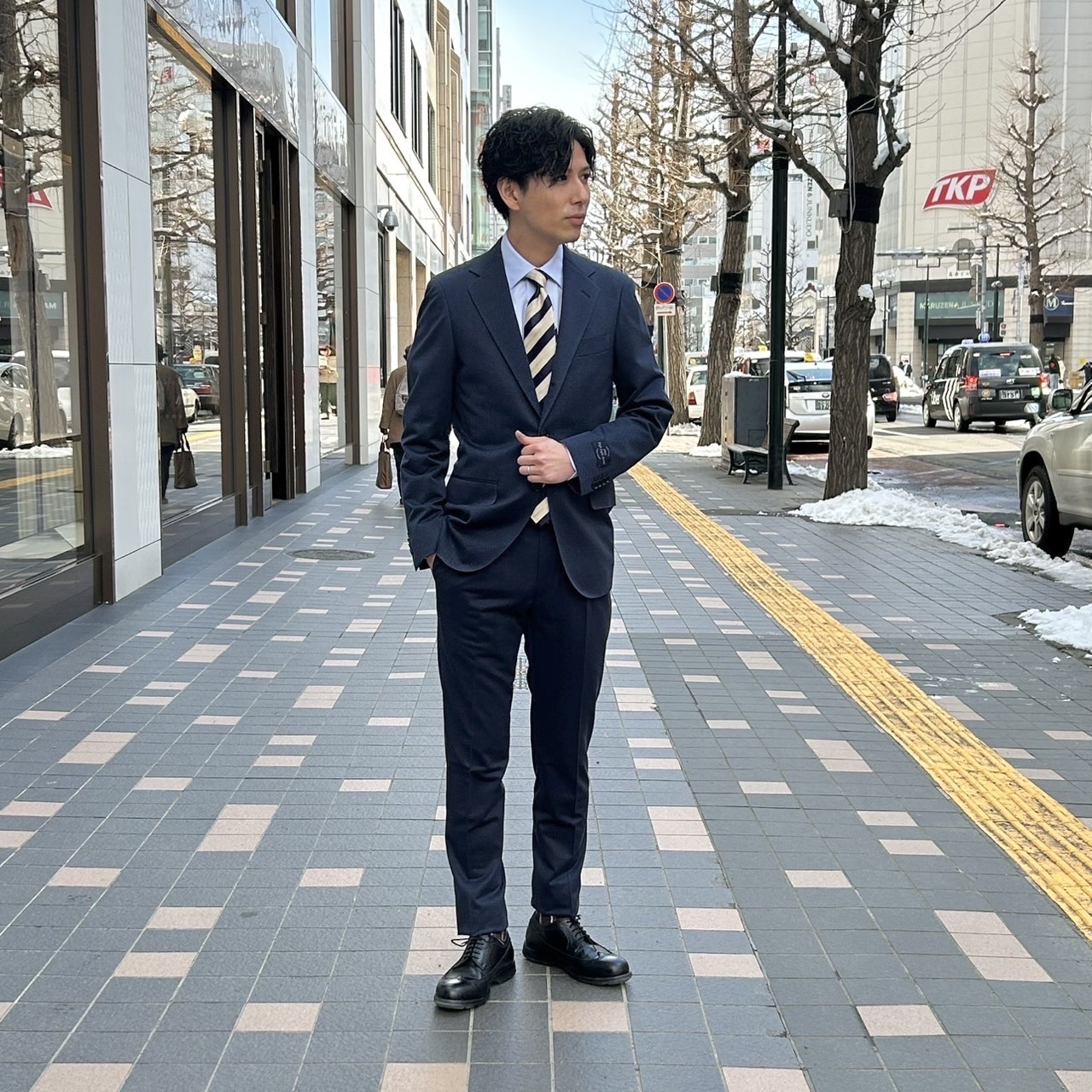 今回はシャツネクタイ等のアイテムにもブルーをいれ爽やかなビジネスマンのコーディネートに仕上げました😆
