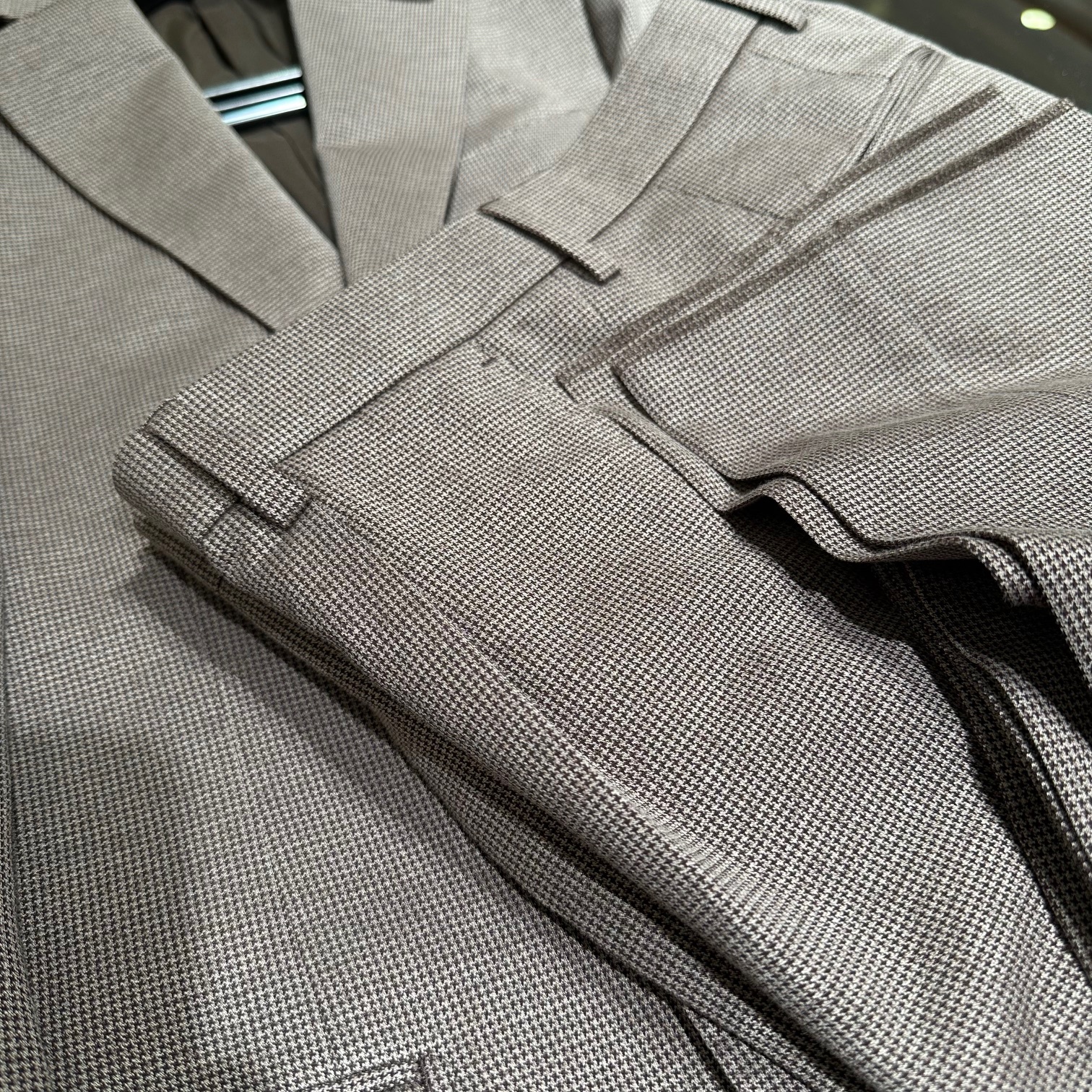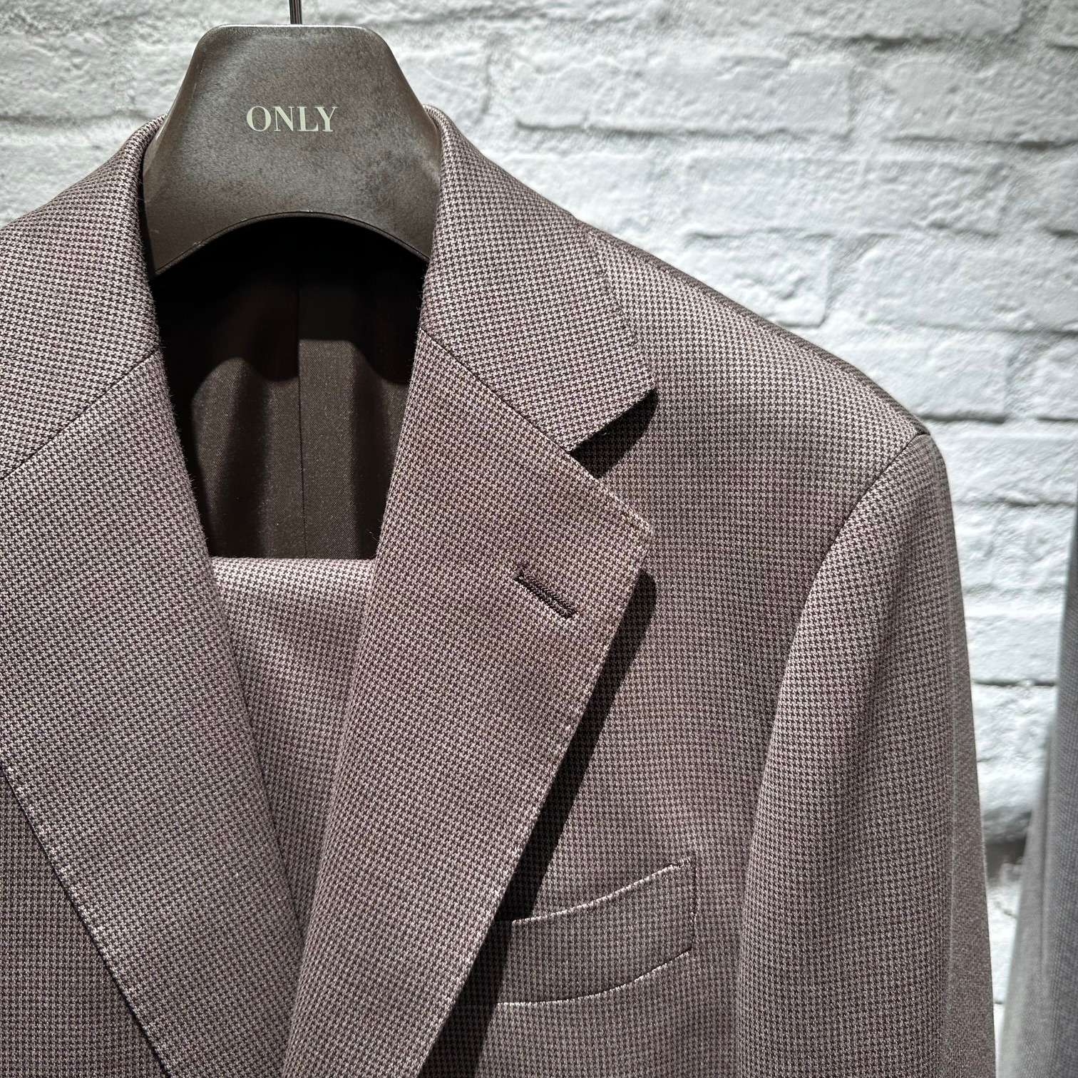 ポリエステルコットンを特殊な製法で編み上げることで、ウールスーツのようなふっくらとした素材感と通気性を実現。