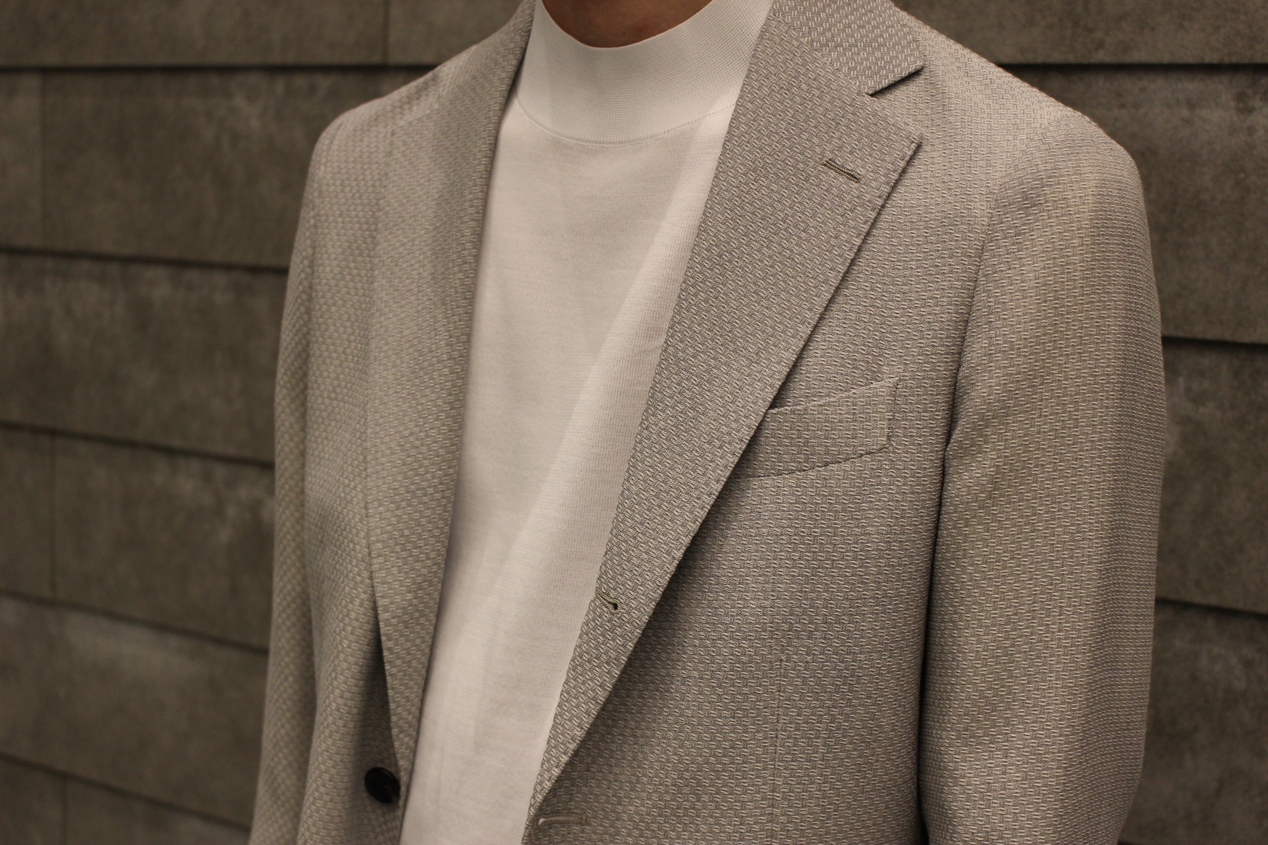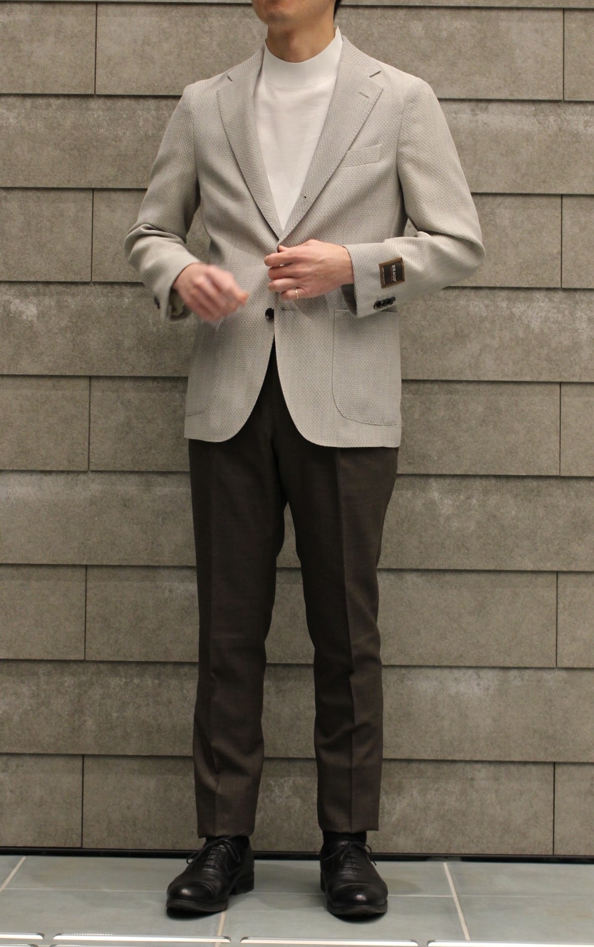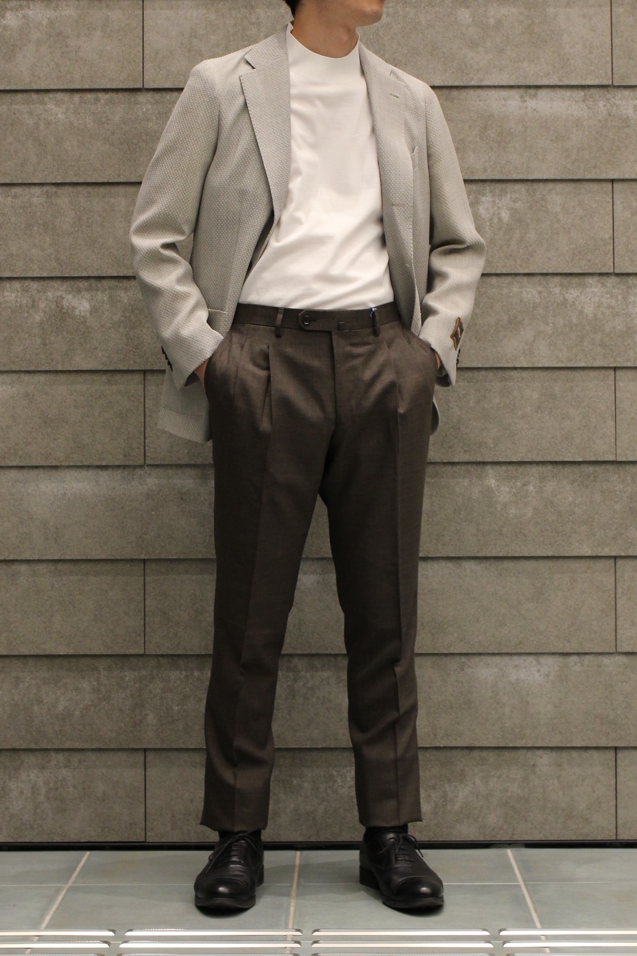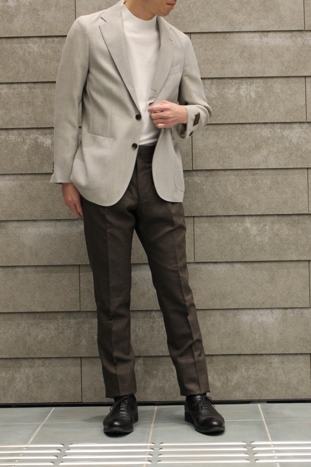 紺のブレザーとグレーのスラックスの合わせは既にお持ちの方が多いと思い、思い切って明るいグレーを主役にコーディネートいたしました。