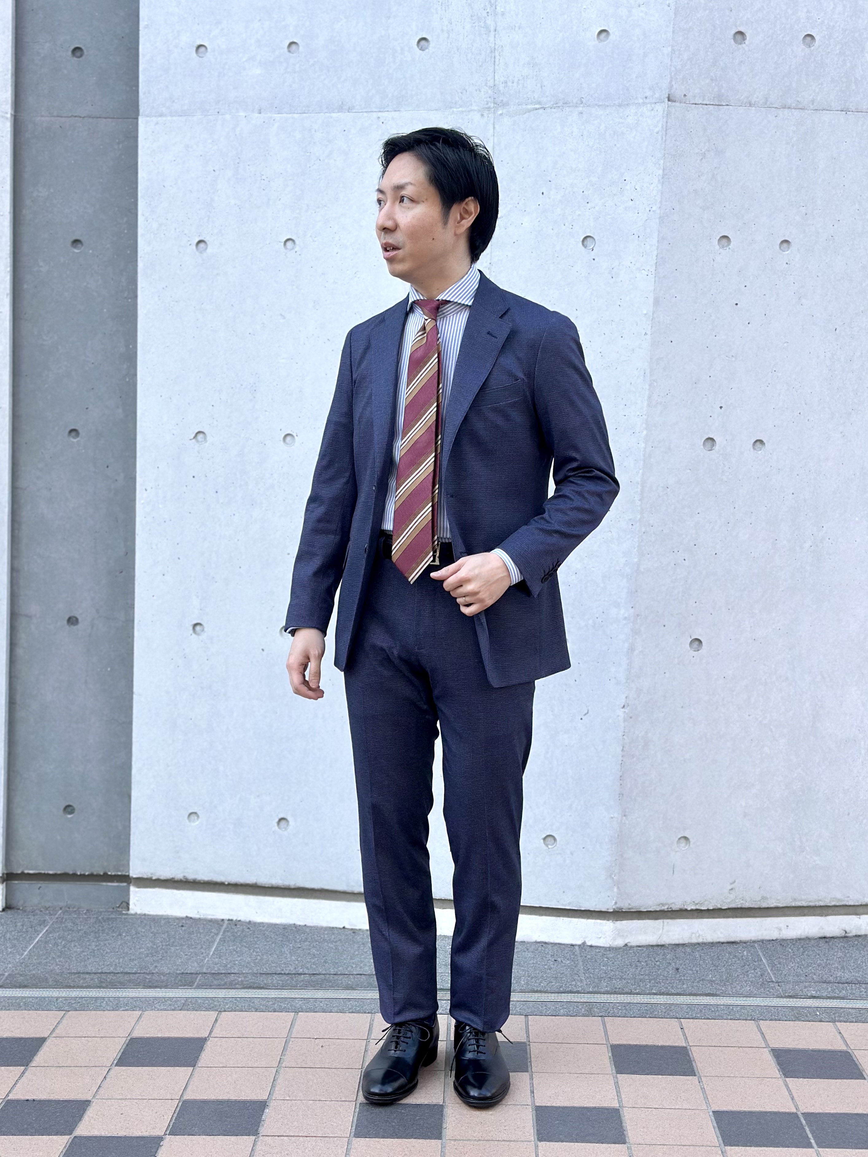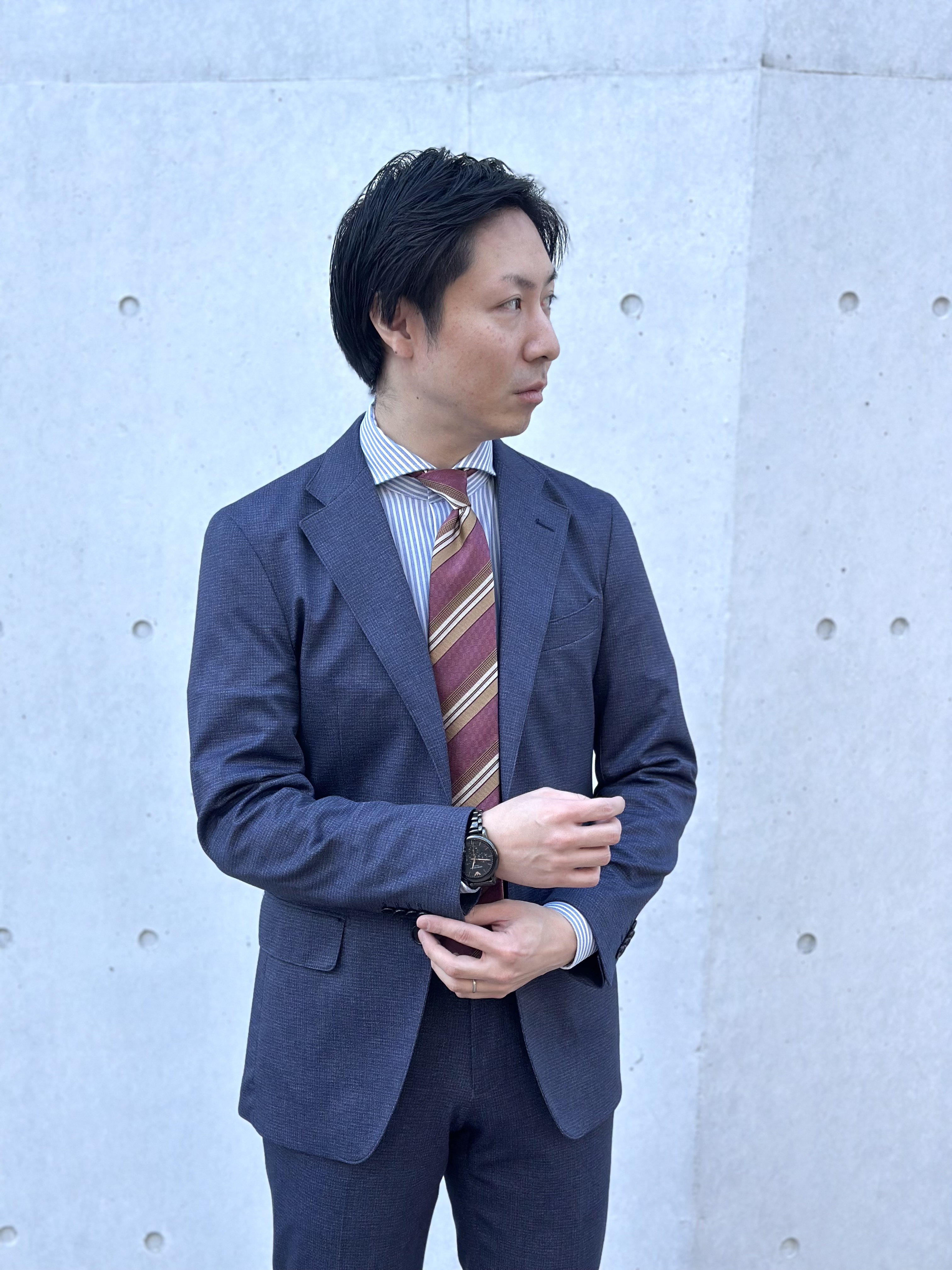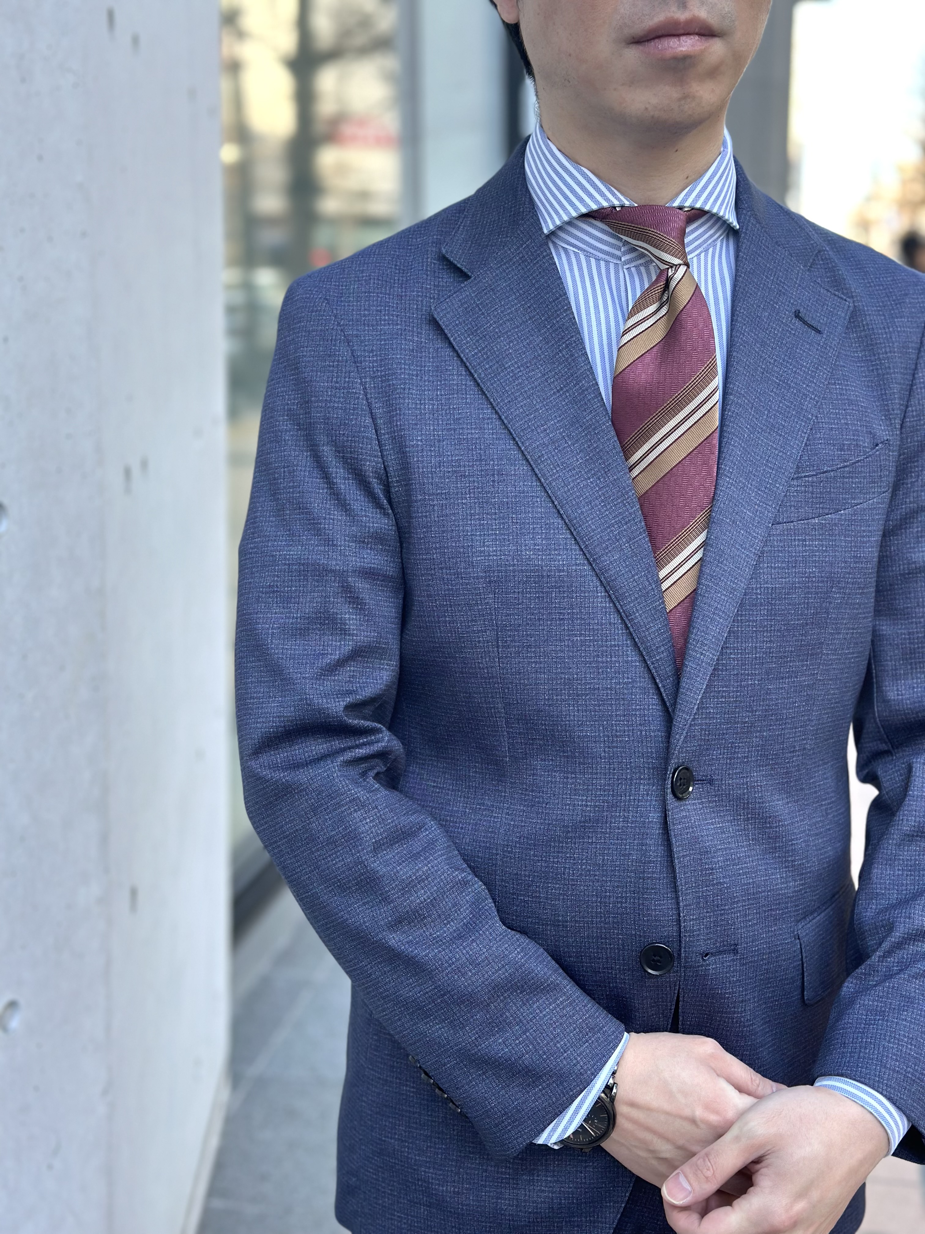 シャツも同系統のブルーで合わせたことでよりネクタイとジャケットのコントラストを際立たせることができました✨