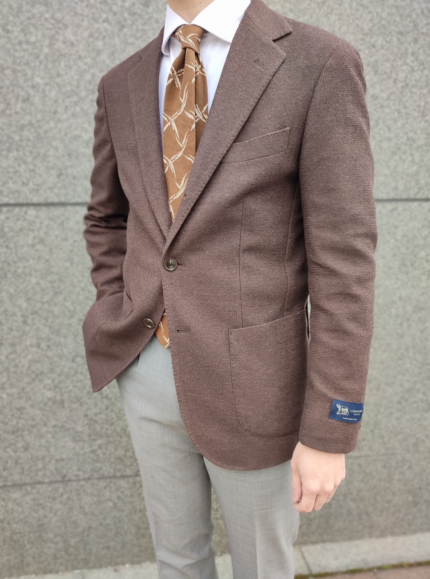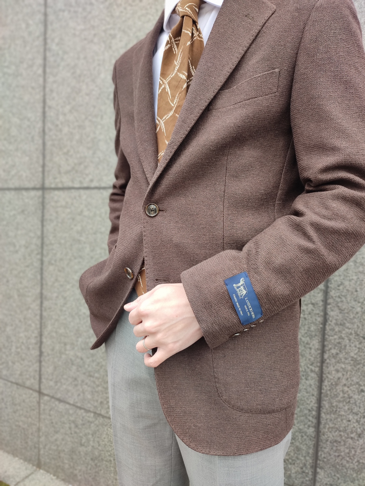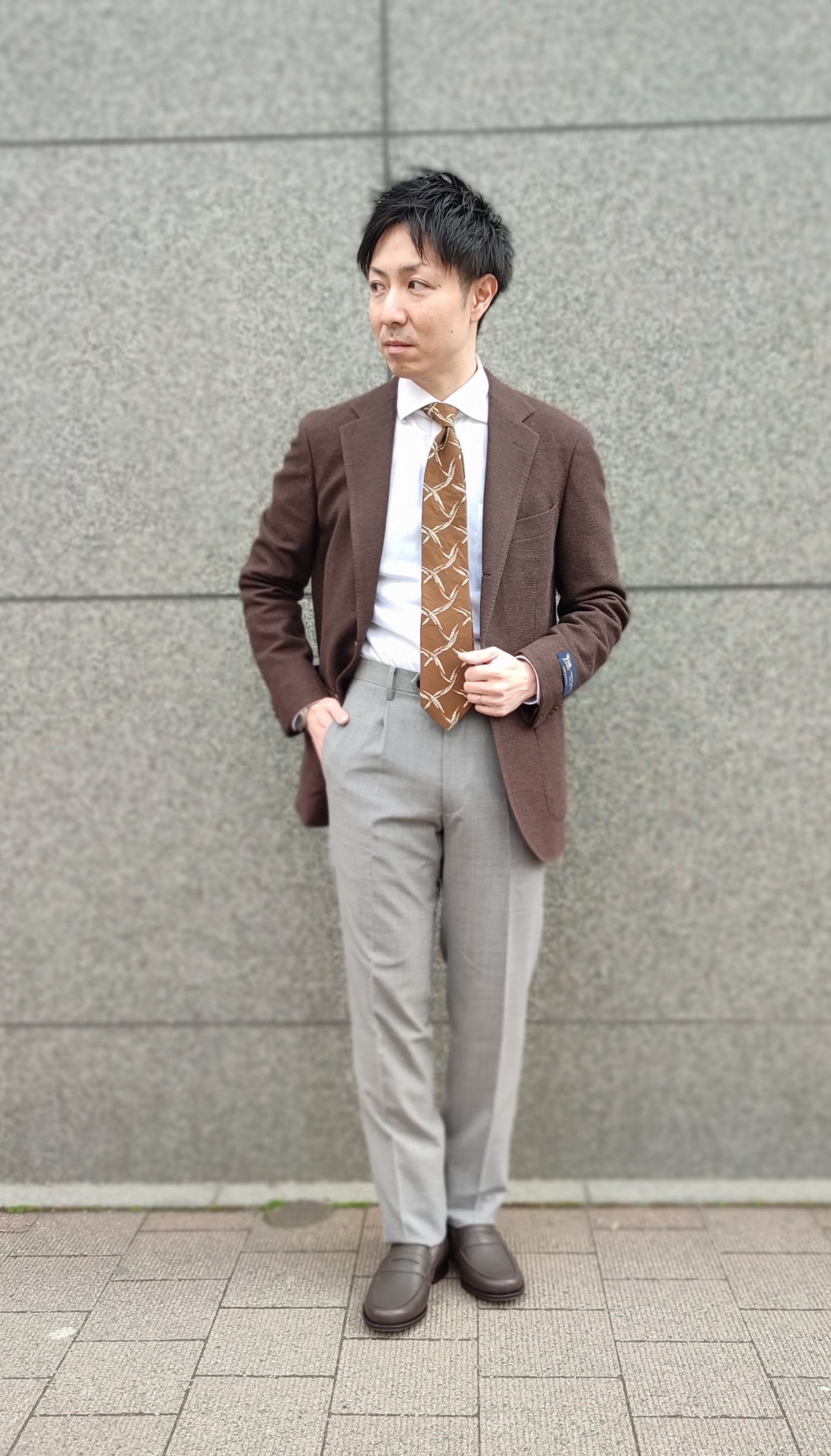 色味の良いジャケットなので、今回は色数を絞って、白シャツ×ブラウンタイの王道Vゾーン✨