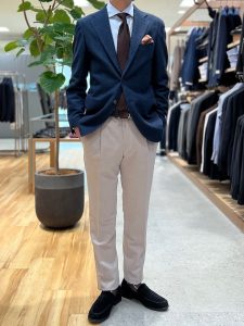 ジャージ素材に定評があるローマ社のネイビージャケットに、非常に軽量な「ハイライトジャージー」のベージュのパンツを合わせた、清涼感のあるジャケパンスタイルです!