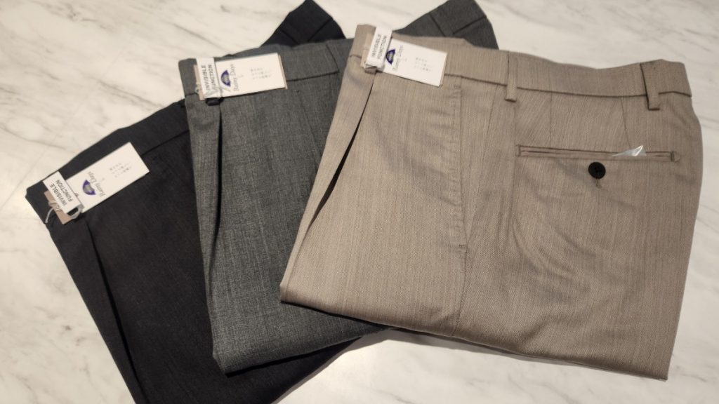 エクストラファインの原毛を使用したウール100%生地に、撥水加工を施した新商品スラックス。
