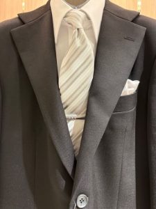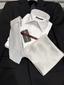 と質問を受けてグレーやホワイトのネクタイをご提案する事が多いのですが、