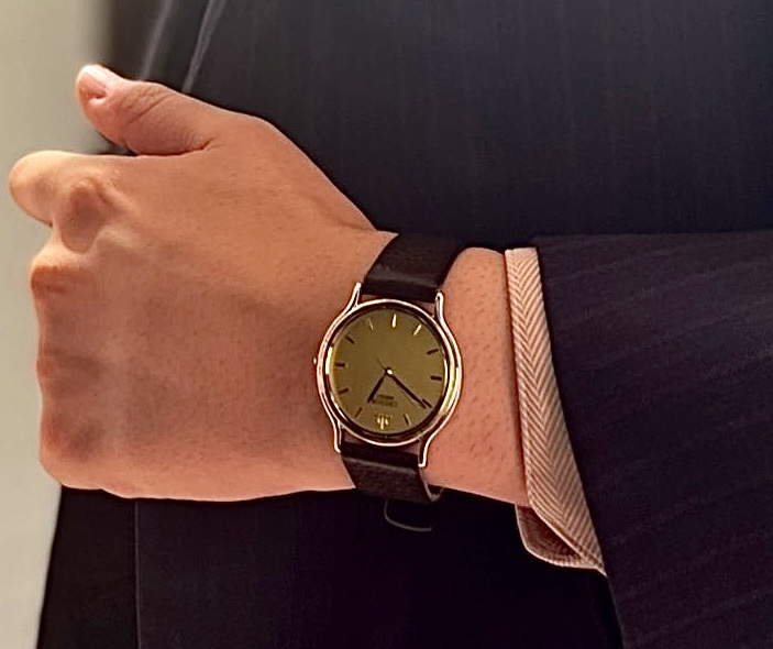 時計のサイズは手首の太さを超えない幅で選ぶことを基本とし、可能であれば3分の2程度の大きさにすると上品に見えます。
