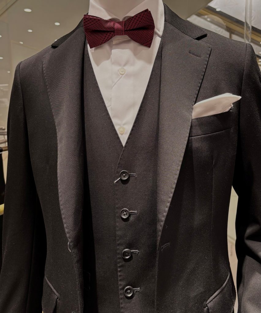 もう一つはウール100%のブラックスーツで、シルエットも細すぎず太すぎず、適度なゆとり感をもっているため、どの年代の方にもお召しいただけます。