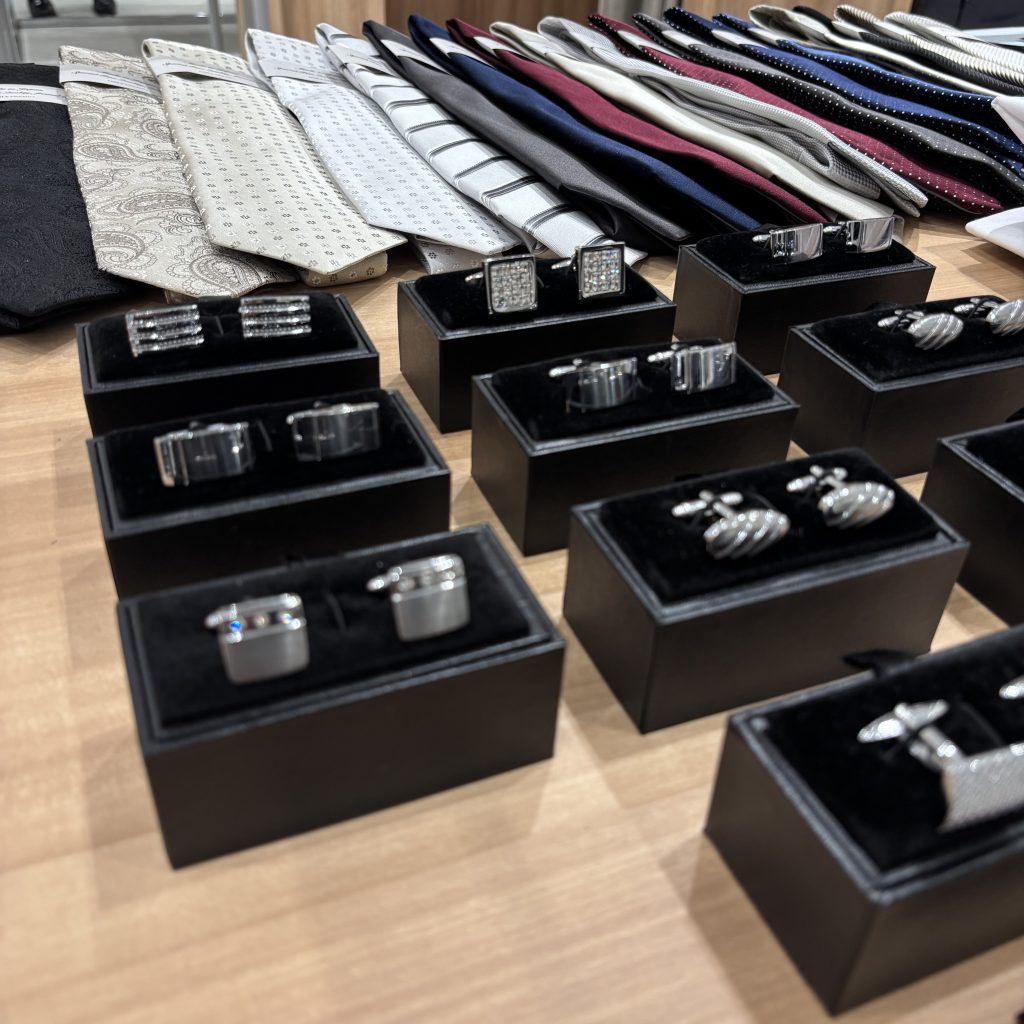 ネクタイやカフスボタン、チーフ等の小物類もご用意がございますので、