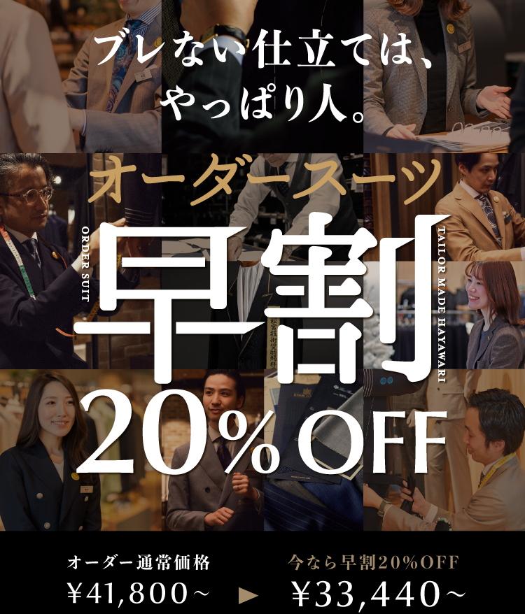 ただいまONLYでは、オーダースーツ早割20%OFFキャンペーンを実施中です。