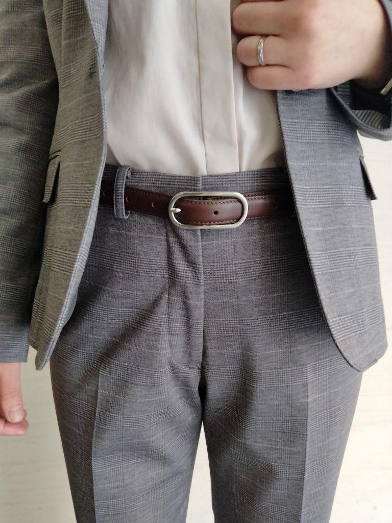 ブラウンのベルトがコーディネートのアクセントに✨
