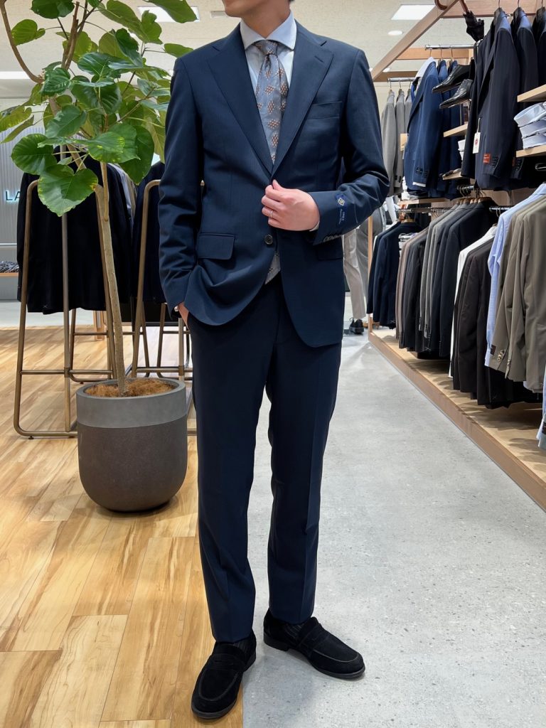 今回は細かいハウンドトゥース柄が配されたネイビーのスーツを選んでみました!