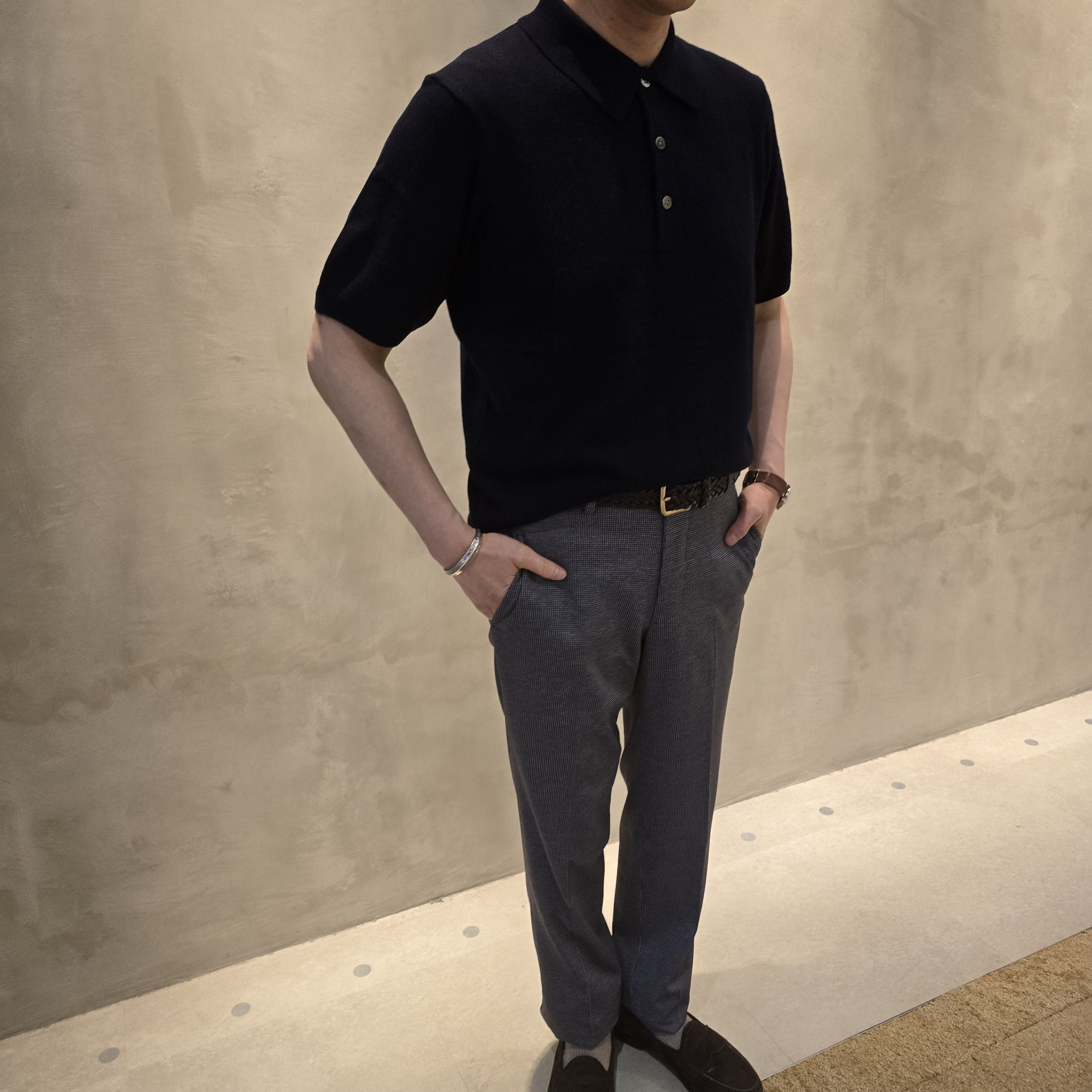 ポロシャツと言えばカジュアルなイメージですがニット素材にするだけでぐっと上品にみえますね。