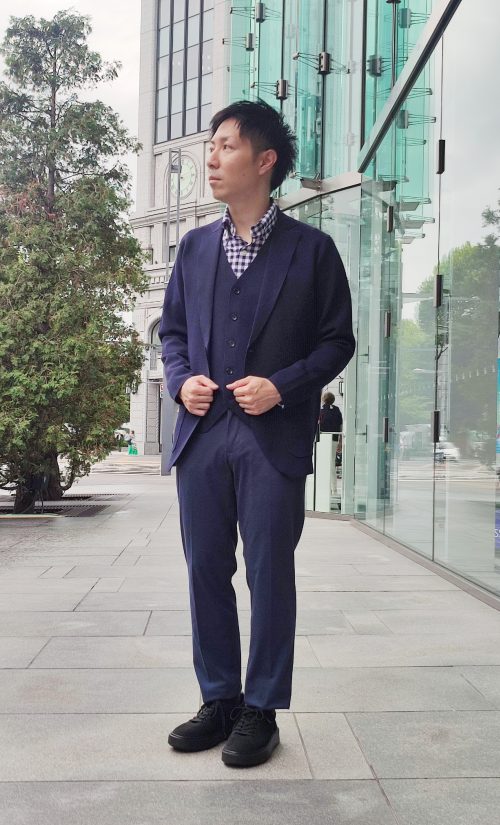 ゆったり目に見えますが以外にも腕周りは吸い付くようなシャープさもあり、