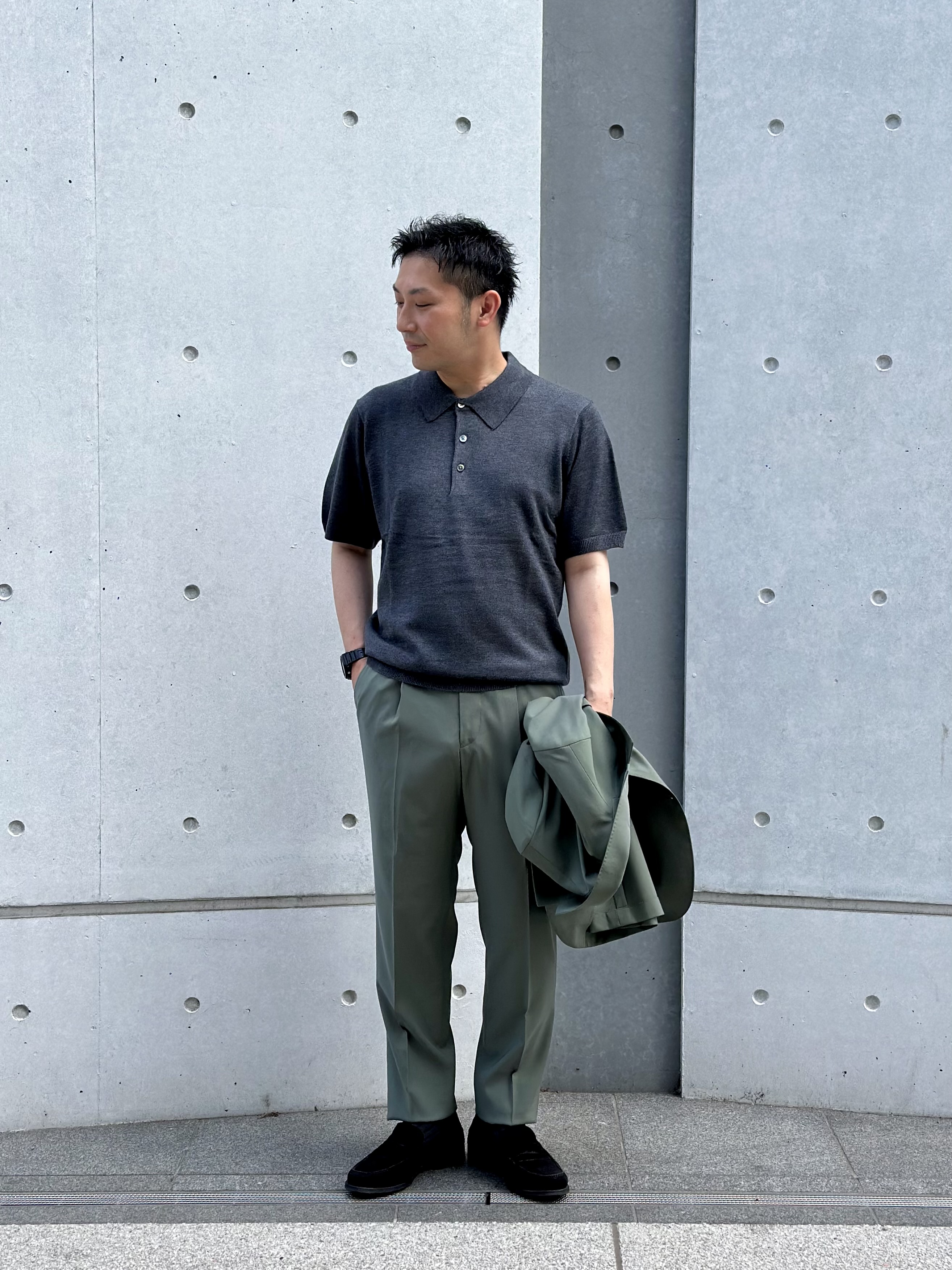 カジュアルな印象のカーキセットアップに、グレーのニットポロを合わせ