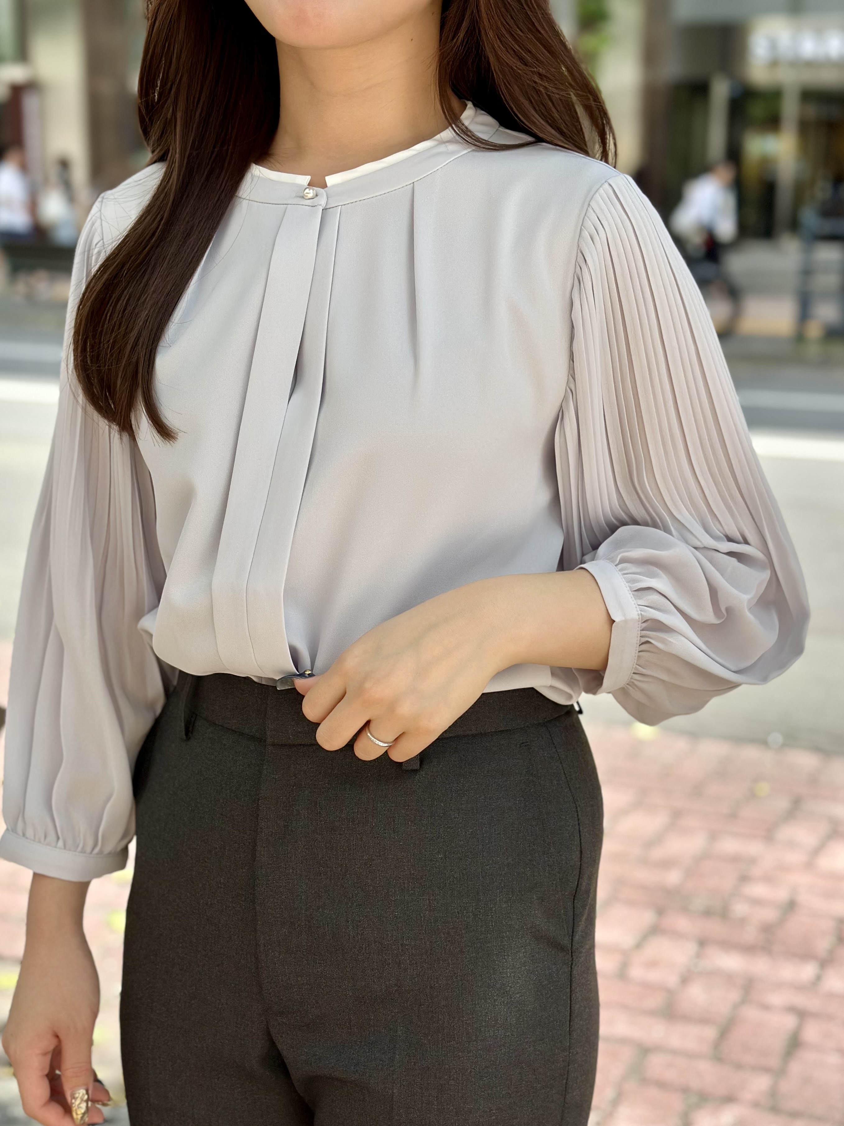 今回はパープルみのあるグレーのブラウスを合わせて