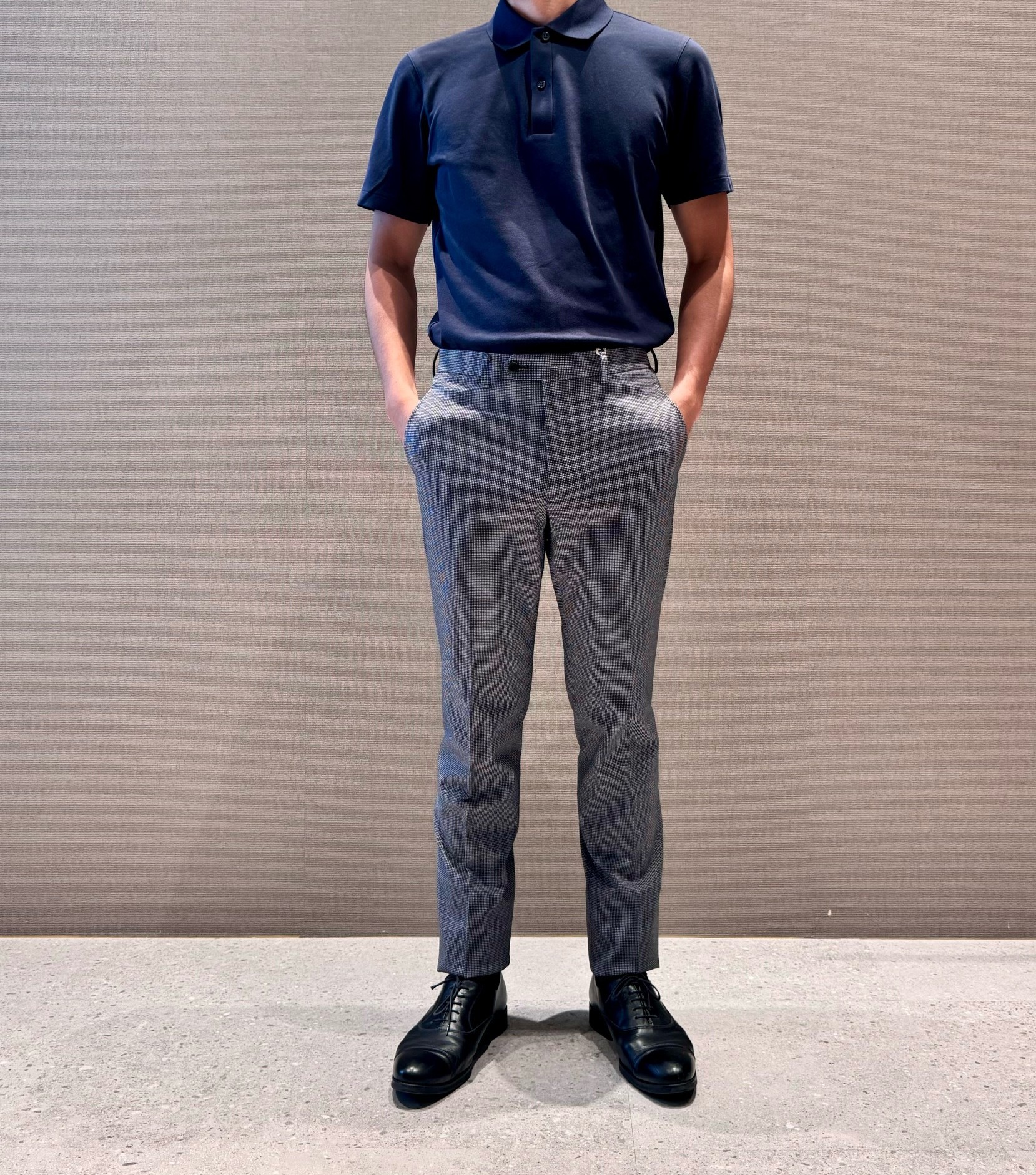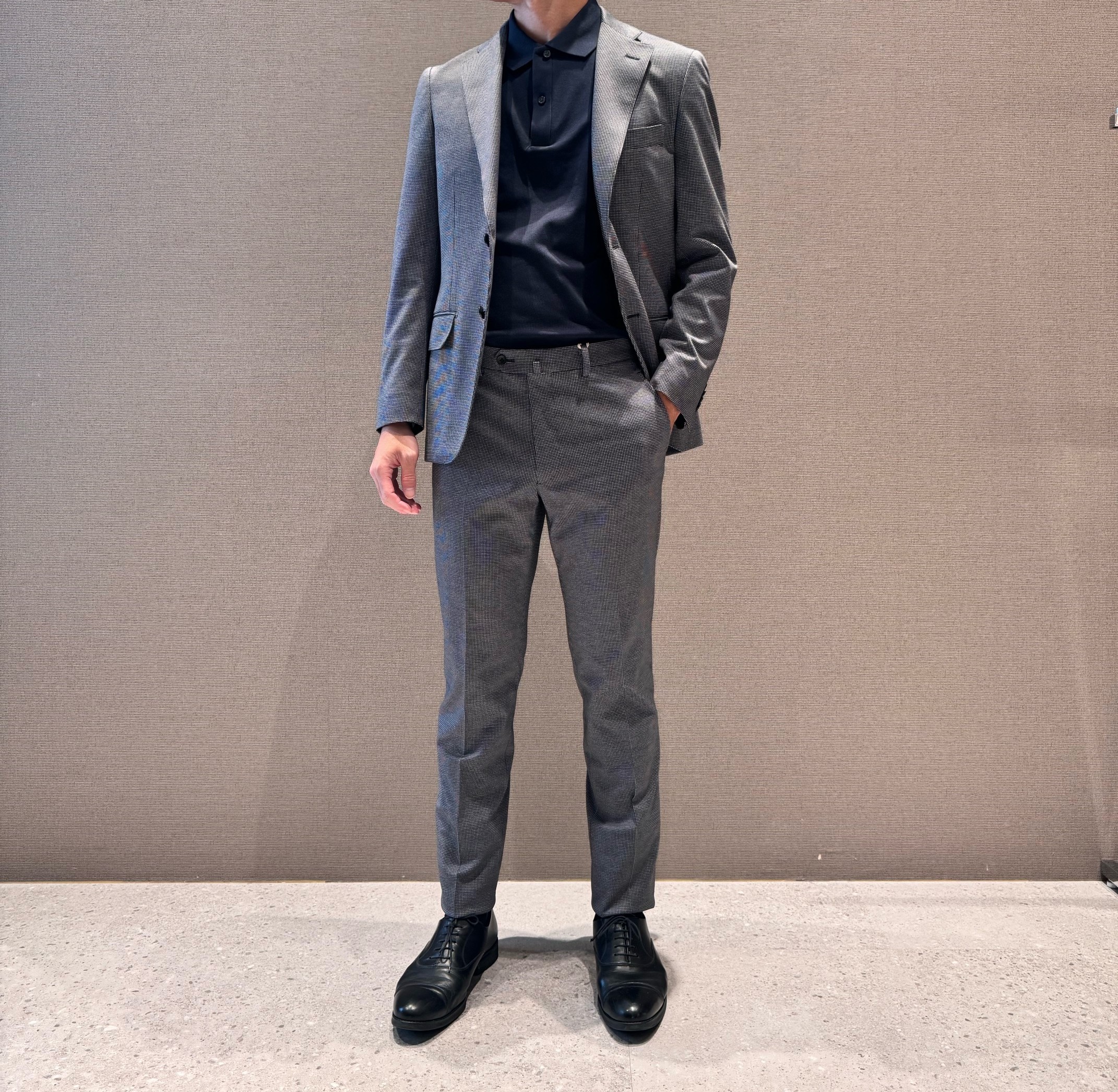 着用セットアップはその中の1色グレー千鳥格子です。