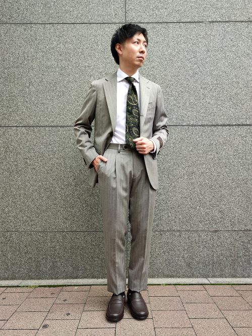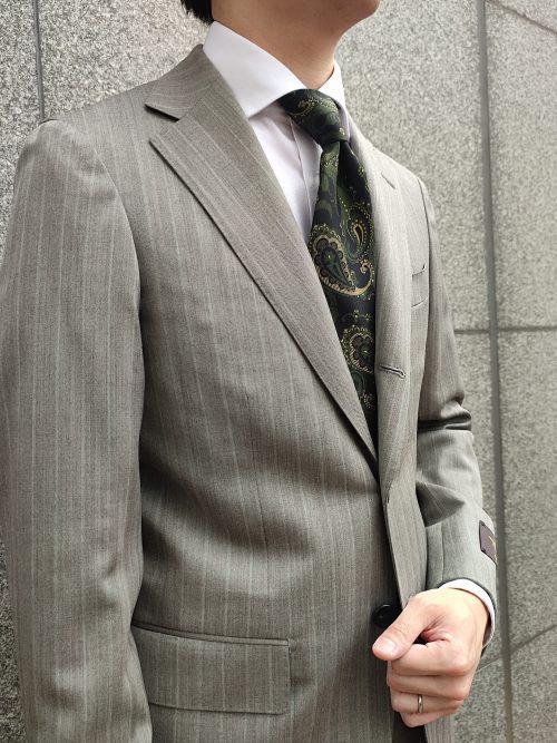 濃いグリーンのペイズリー柄ネクタイでよりスーツの持つ雰囲気を高め、調和のとれたコーディネートにしました😊✨