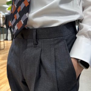 肩回りは少々構築的でありつつもイタリアらしい首の吸い付きが特長のジャケットと、若干のゆとりをもたせたシルエットを採用した新型2タックデザインのパンツのパルマモデル。