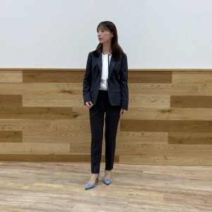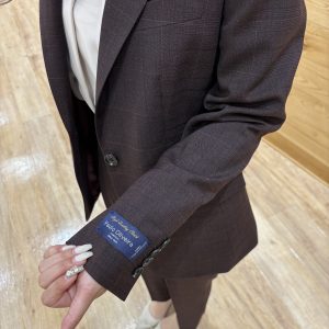 ウエストラインがしっかりとでるジャケット、テーパードの効いた細身のパンツ。