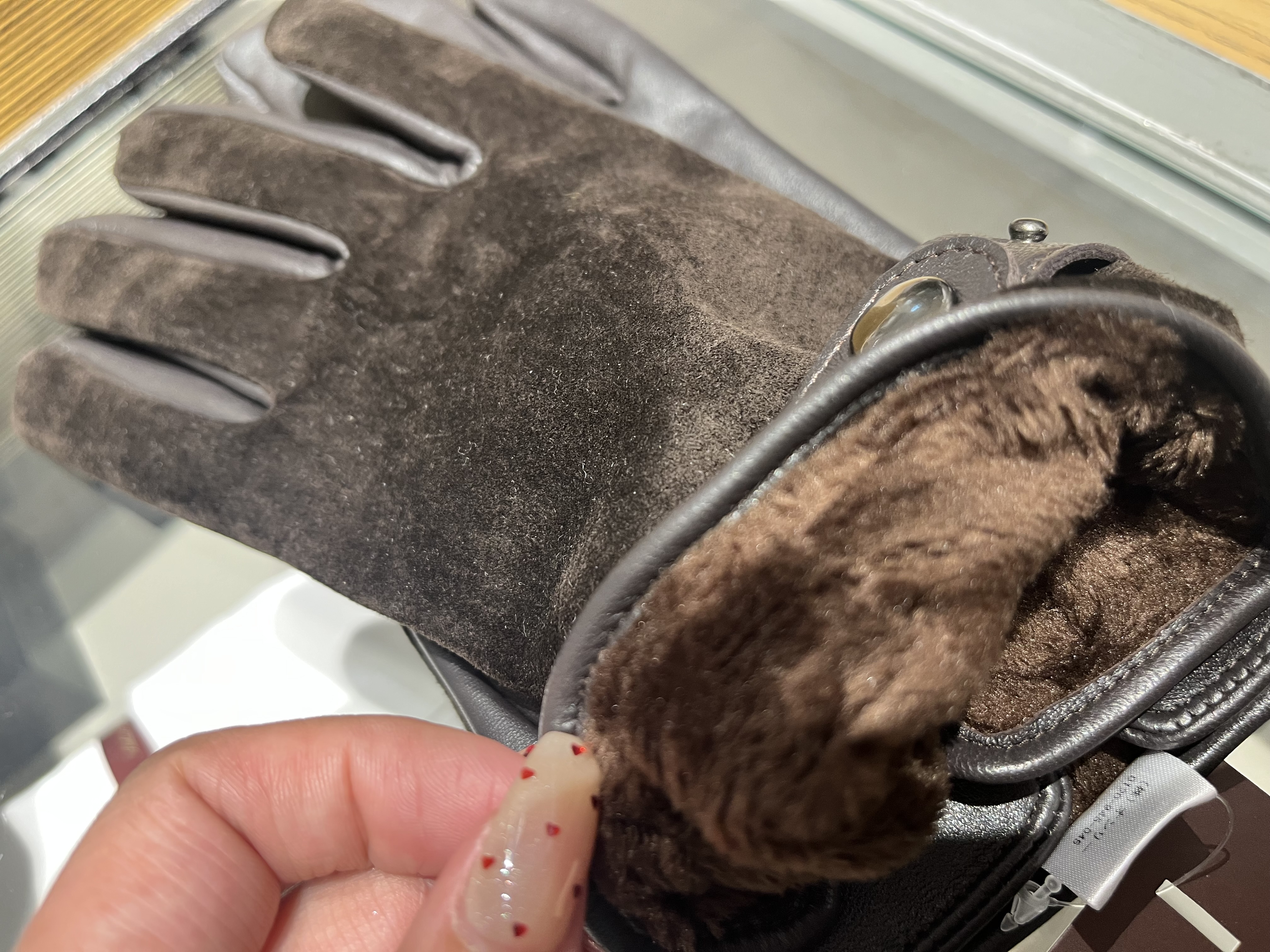 ⇧こちらは、拳部分を羊革🐏、甲部分を豚革🐖を使用しております。