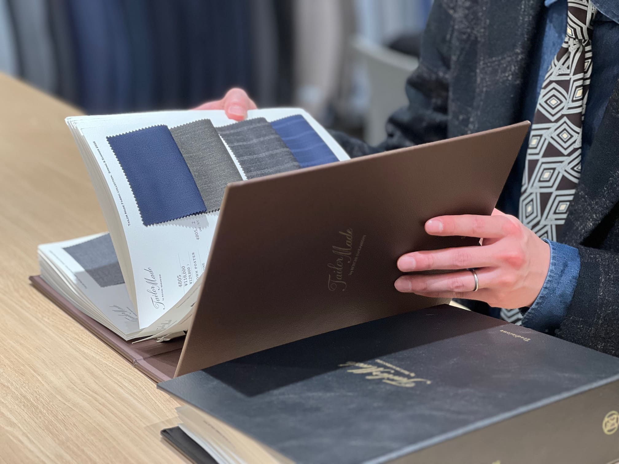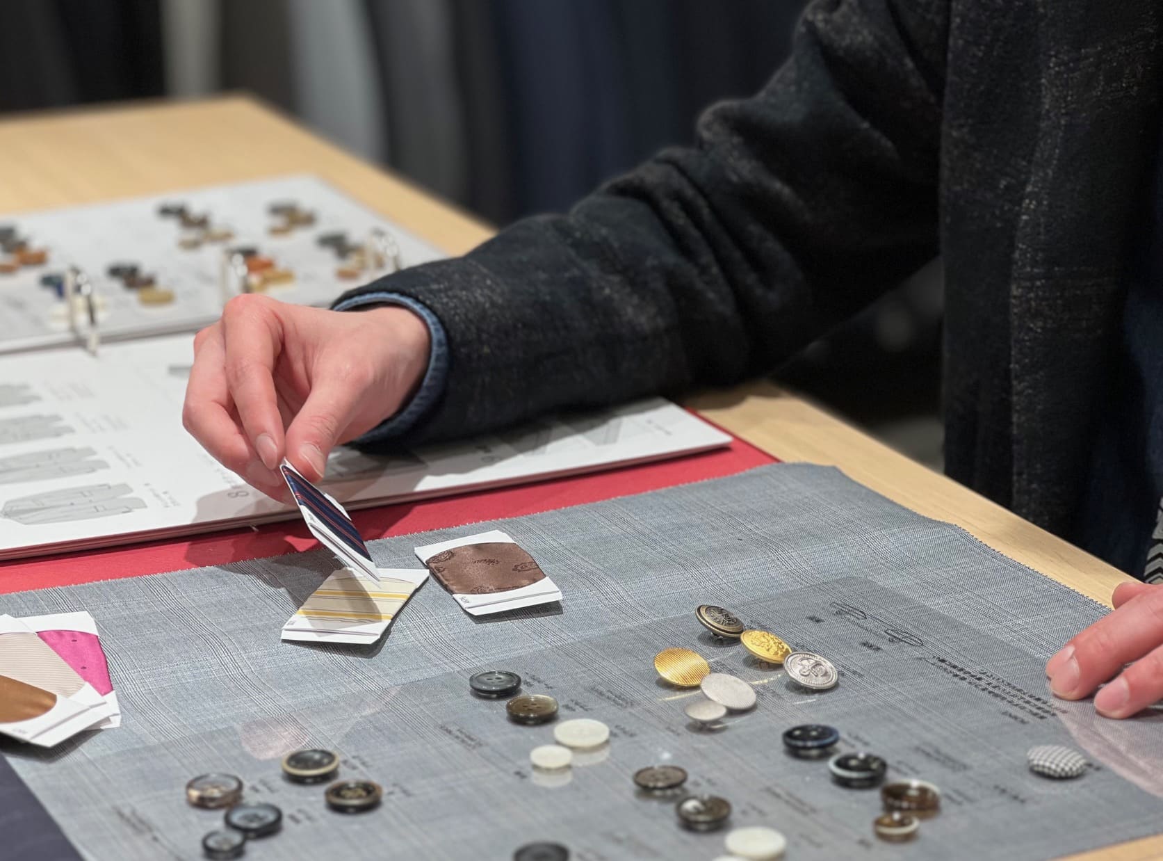 ボタンや裏地、その他スーツの細やかなオプションをお選びいただき、オリジナルの一着にアレンジしていきます。