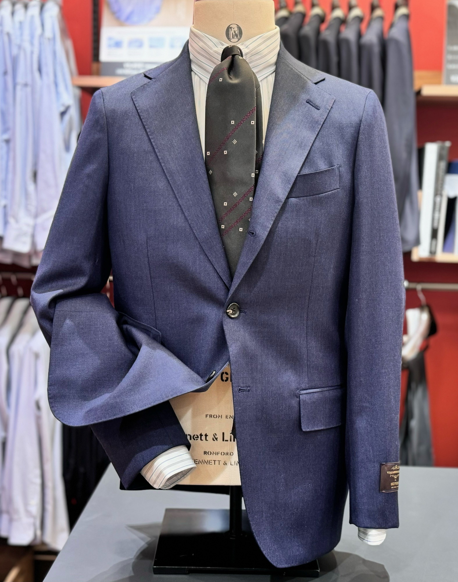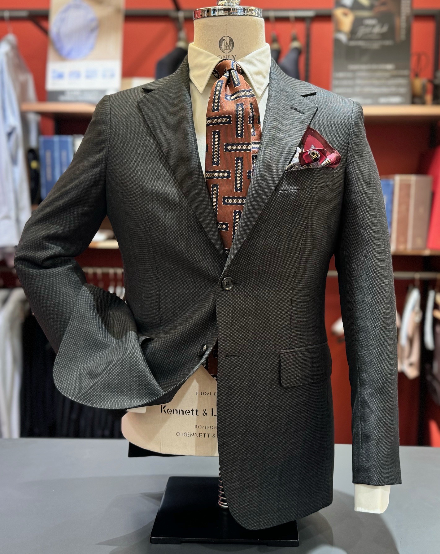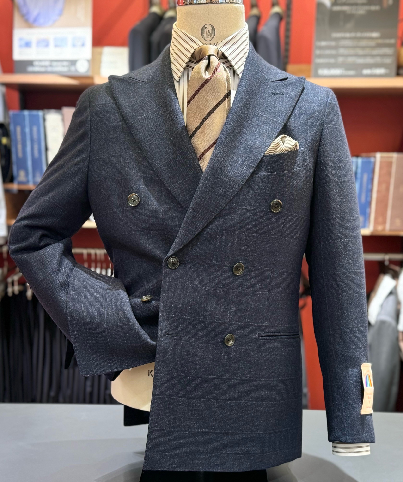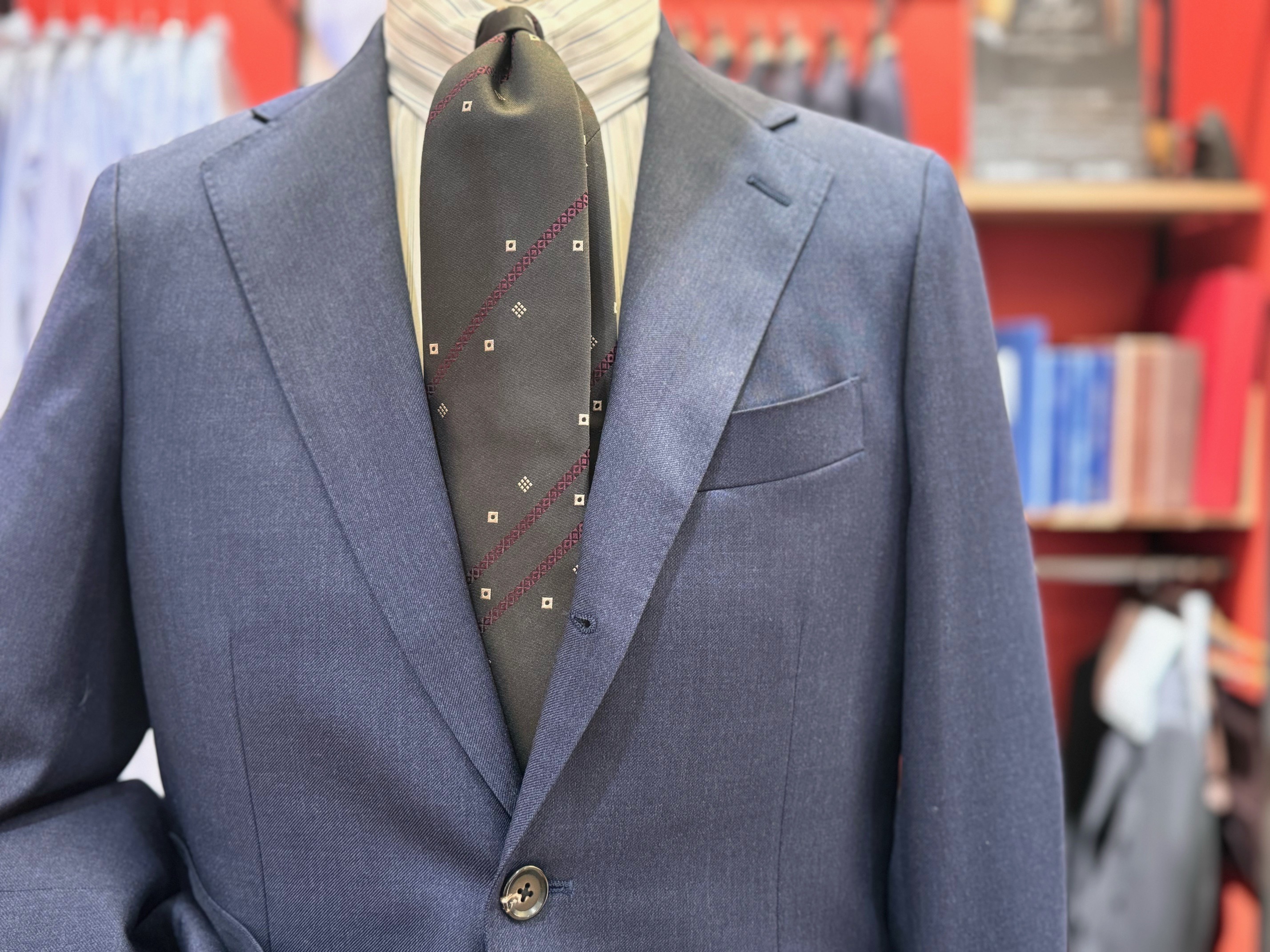 バーズアイにオーバーペーンが入ったスーツは伊ロロ・ピアーナの物です。こういった表情がある生地は中々見つけられません。