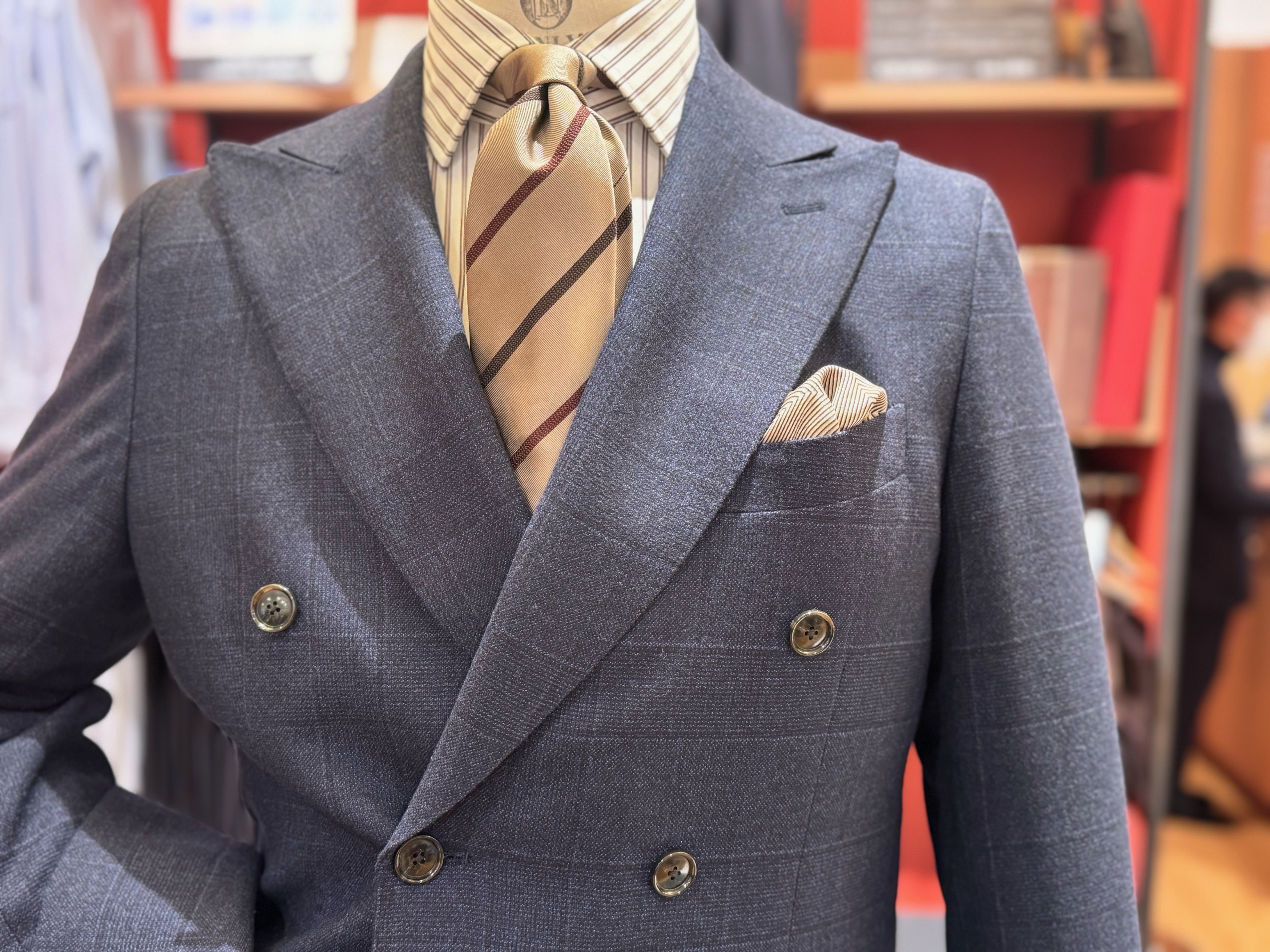 ❷威厳のあるダブルスーツに温かみを出したコーデ