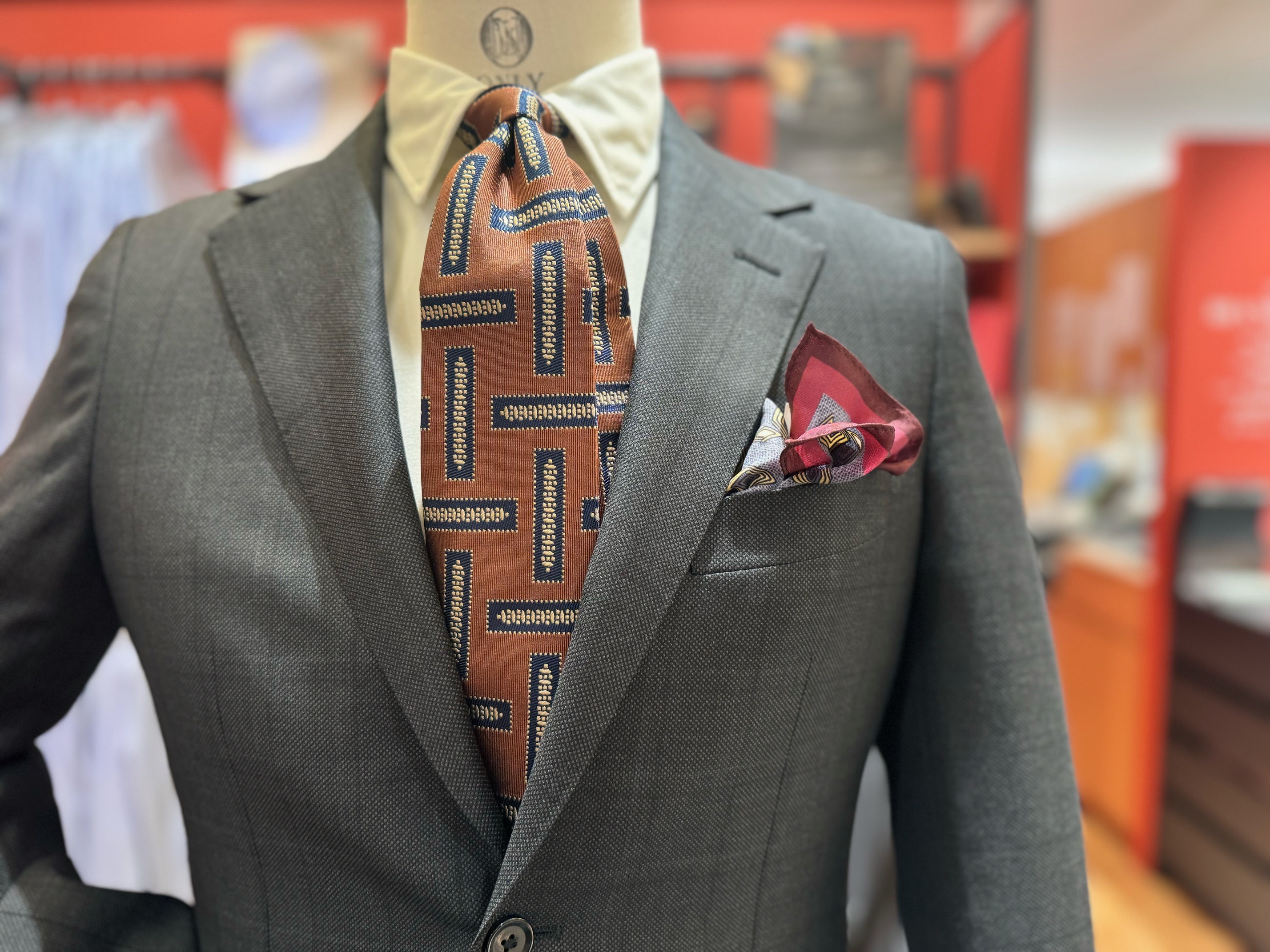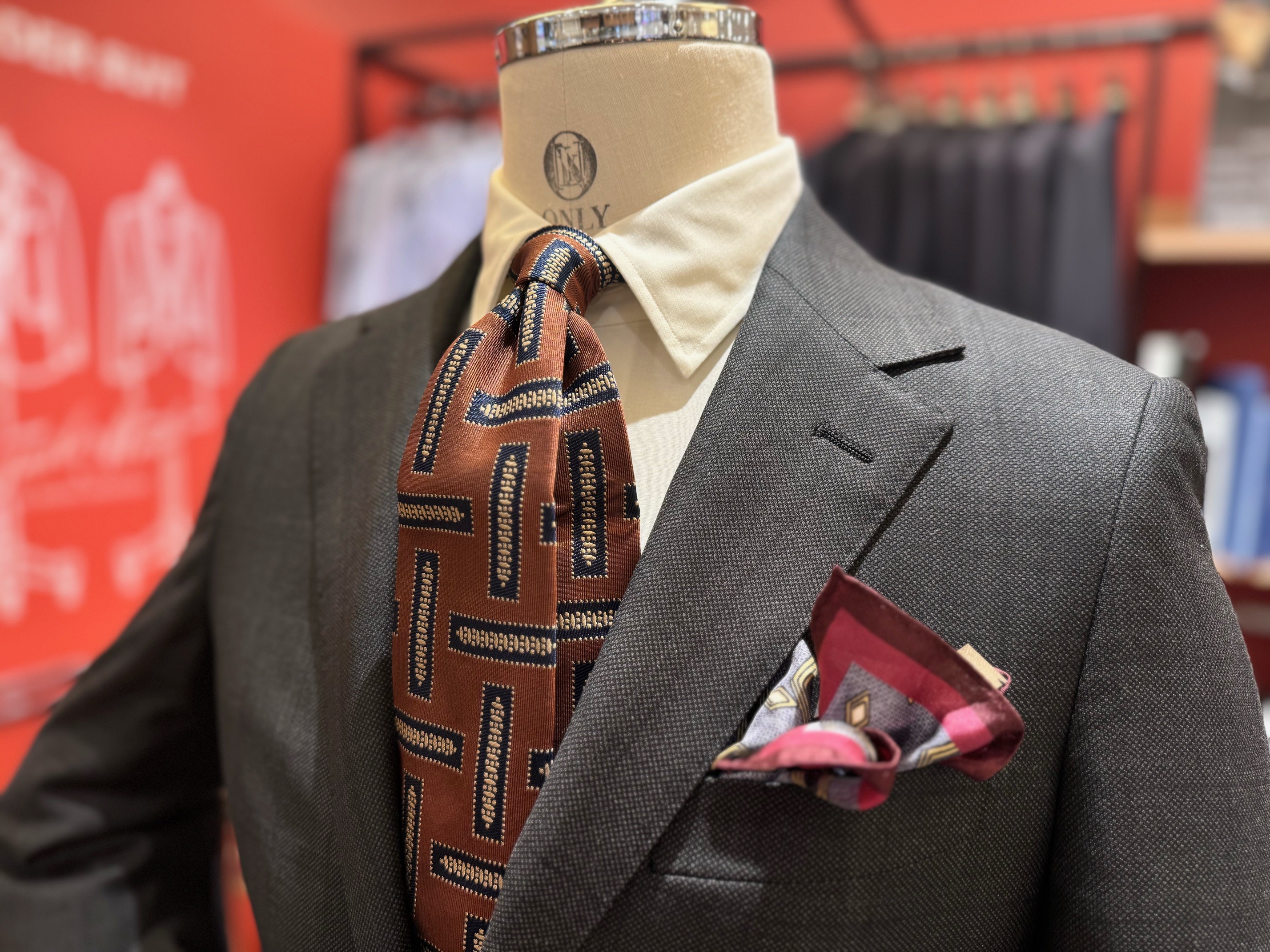ネクタイは先ほども登場した幾何学模様系統のオレンジを使用しており、華やかさも十分です。