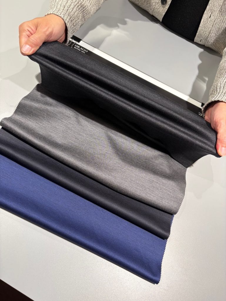 日本の尾州とのコラボレーションで開発された生地は上品な光沢感と軽やかな着心地がスーツ・ジャケット・パンツ、、、