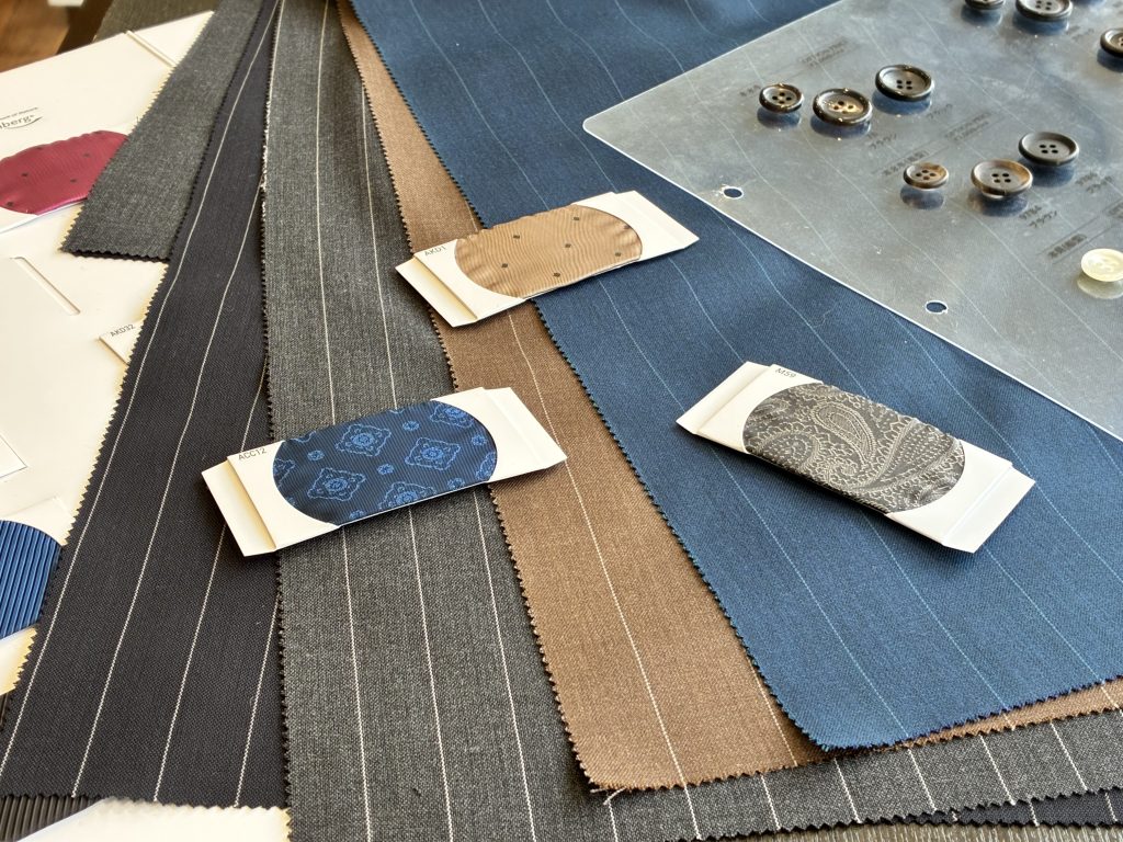 ボタンや裏地、その他スーツの細やかなオプションをお選び頂き、オリジナルの一着にアレンジしていきます😊✨