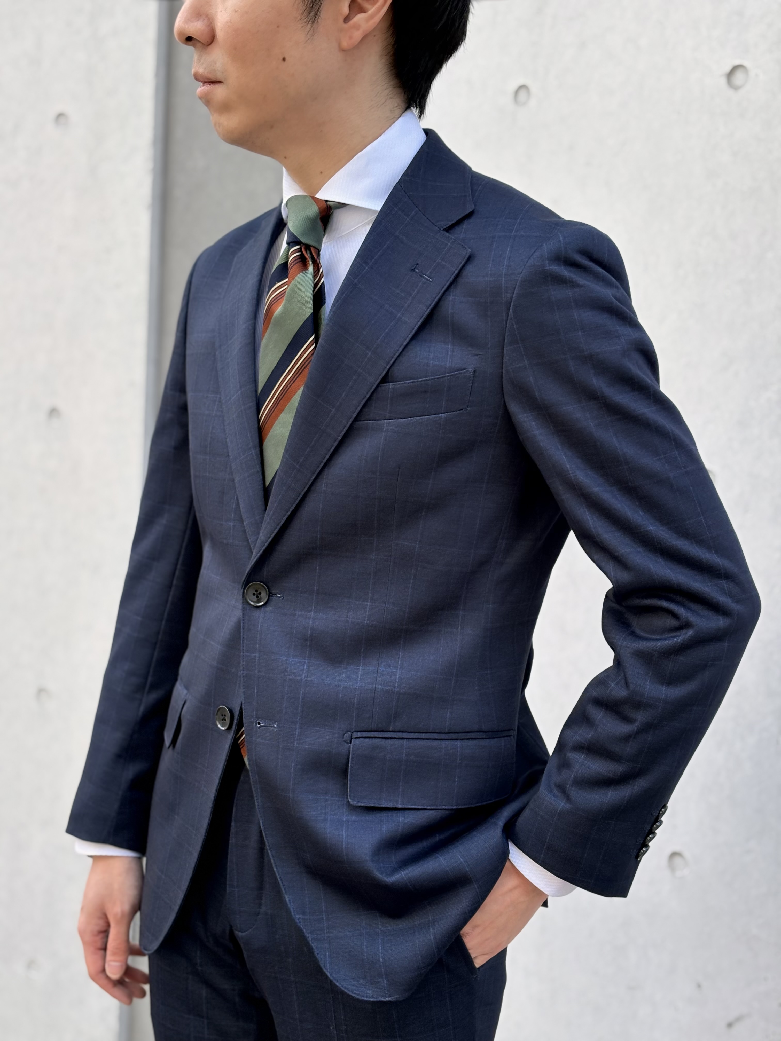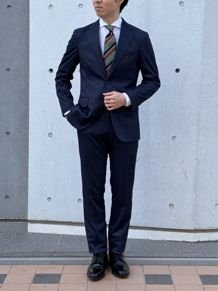 こちらはグリーンのタイを合わせ、きちんと感を意識したスタイリングに。