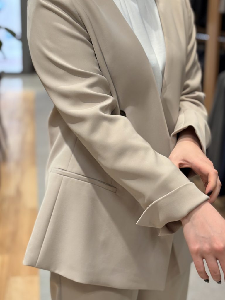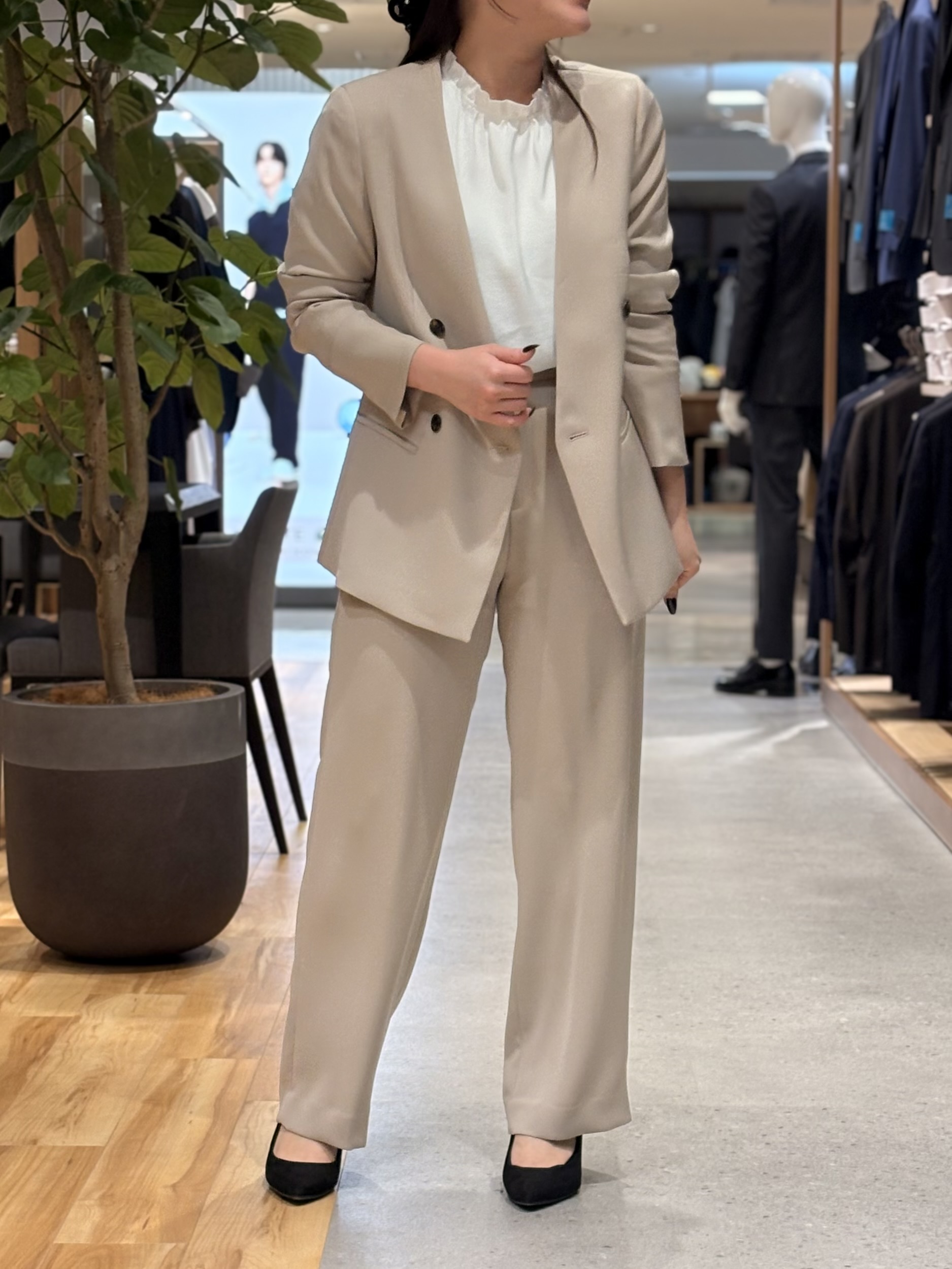 柔らかさと品を両立したノーカラーダブルジャケットは