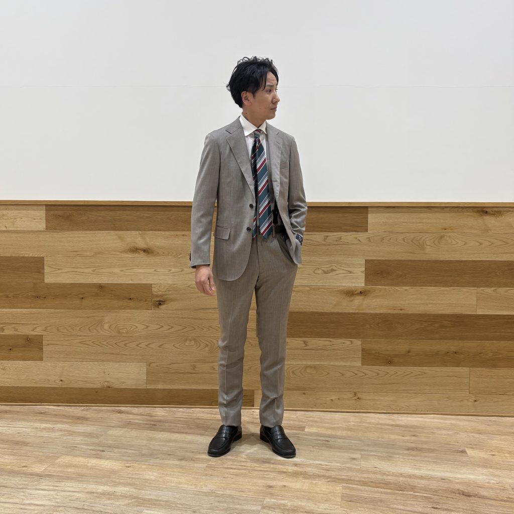 春らしいベージュがかったライトグレーの新作スーツ。